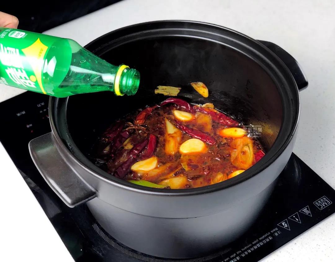 步骤4、放入1勺郫县豆瓣酱炒出红油后倒入250ml雪碧;