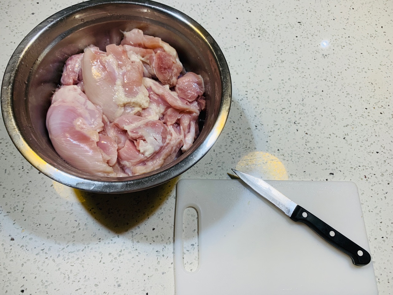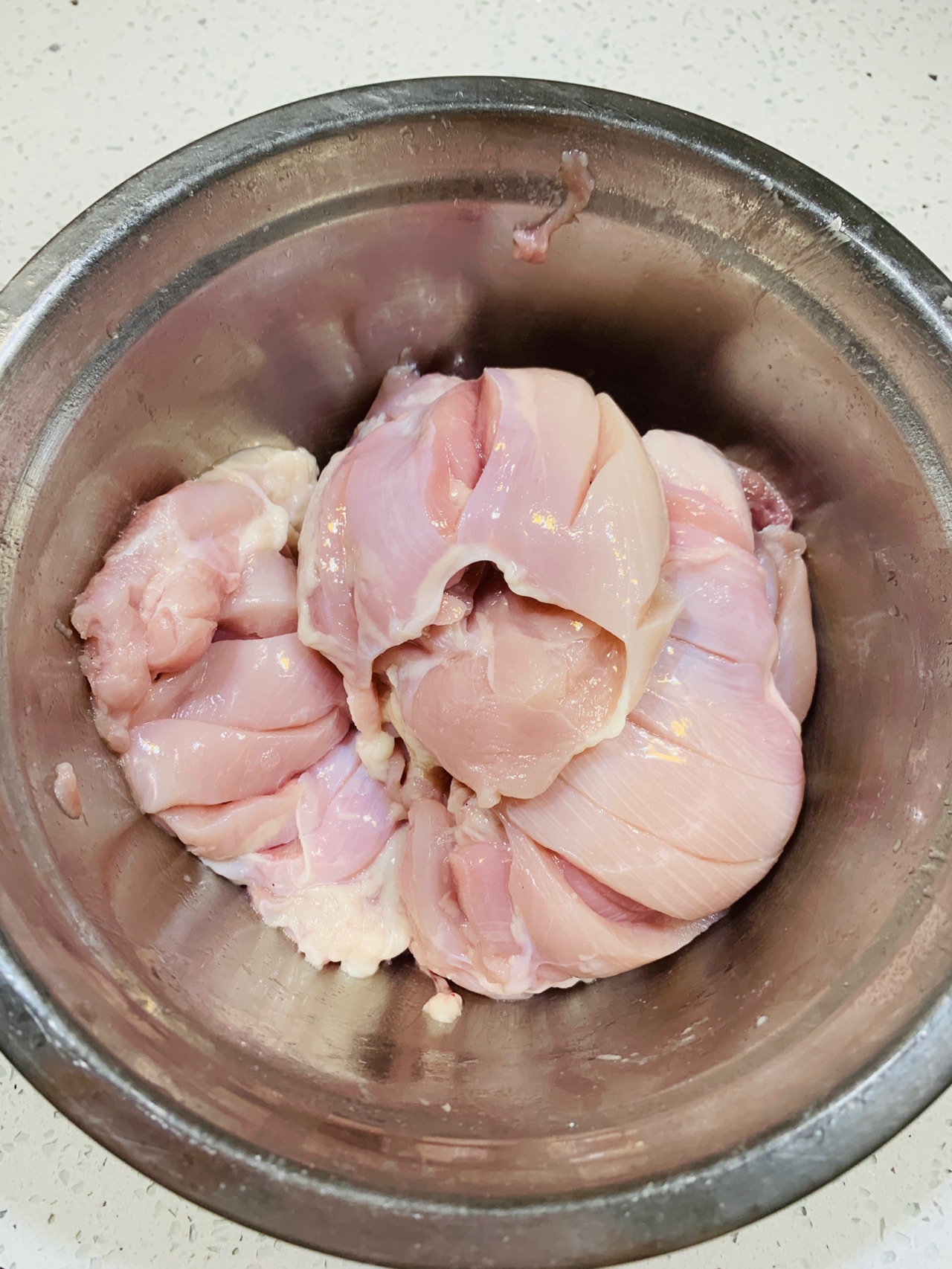步骤1、将买回来的去骨鸡腿肉洗净,改刀,减少它炸的时间