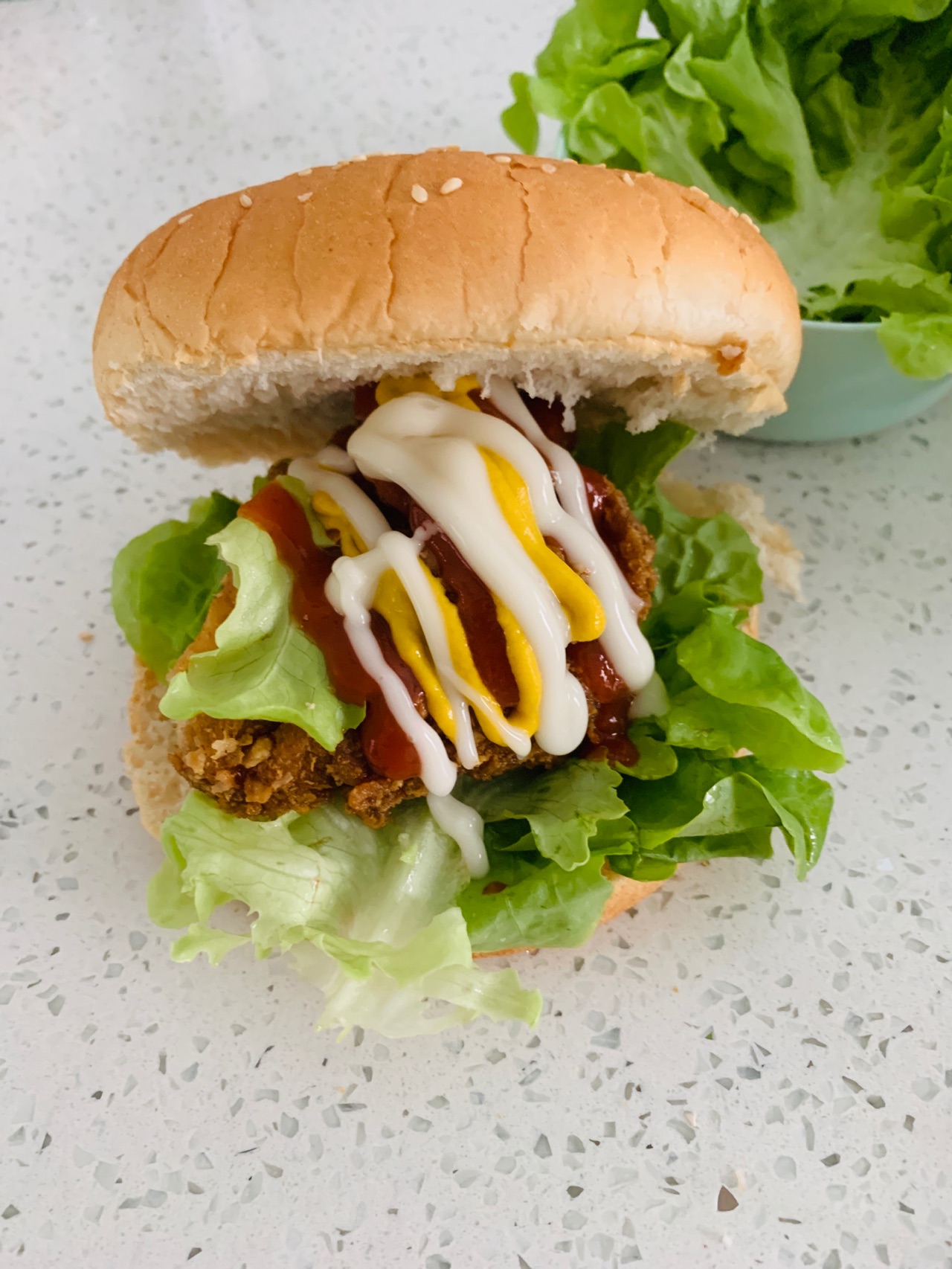 辅料:芝士片6片、生菜适量、沙拉酱适量、番茄酱适量、美式芥末酱适量、腌肉调料、花椒粉3g、辣椒面2g、盐3g、蚝油8g、炸鸡粉、全麦面粉500g、五香粉5g、盐5g、淀粉5g、小苏打3g