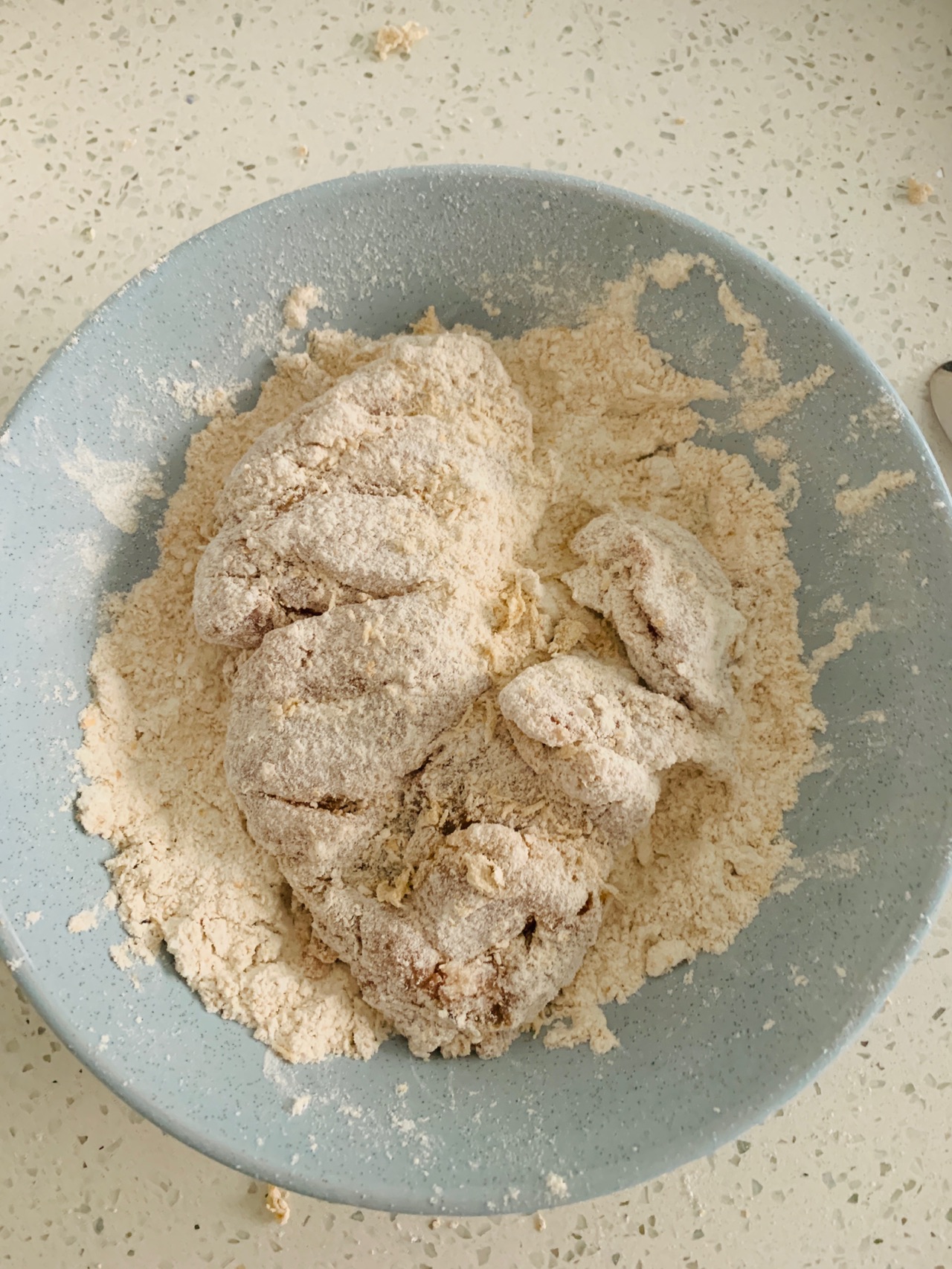 步骤6、将冰箱里的鸡腿肉取出,裹上炸鸡粉