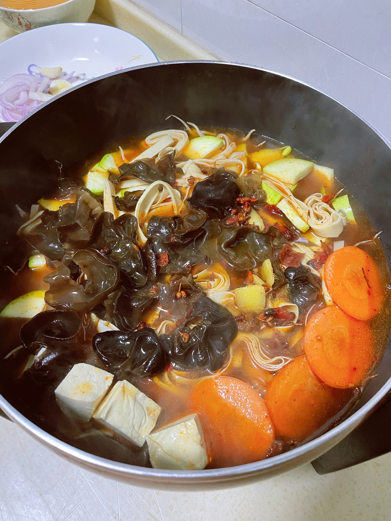 辅料:干辣椒适量、郫县豆瓣酱3大勺、海底捞火锅底料2大勺、大葱1棵、大蒜1头、姜适量、料酒2大勺、生抽2大勺、盐3小勺、千张2张、花生米适量、西葫芦半个、胡萝卜半根、豆芽200克、粉条1把、黑木耳10个、洋葱半个、花生米200克