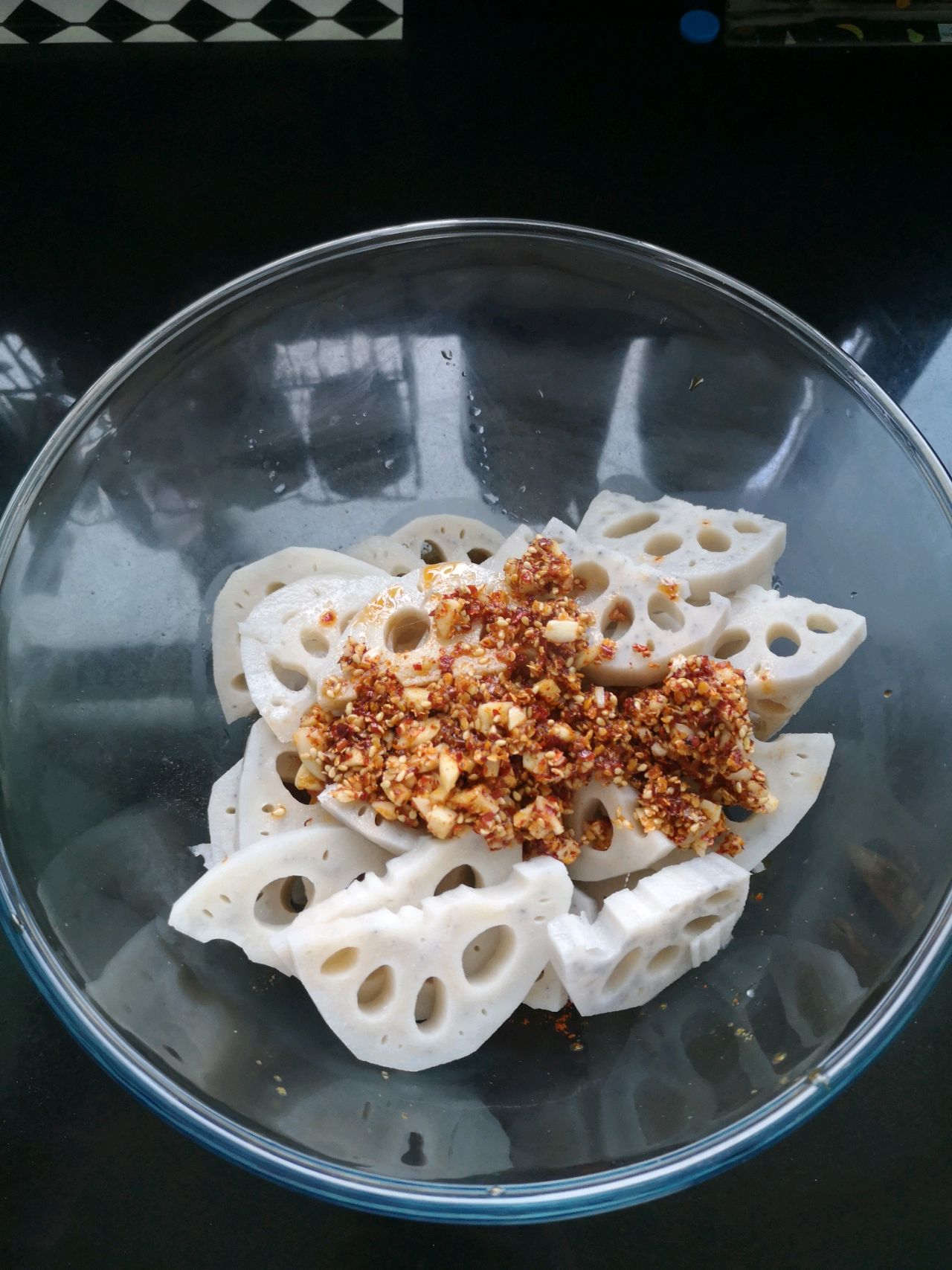 步骤12、加上油冲过的(蒜、辣椒面、芝麻)搅拌~