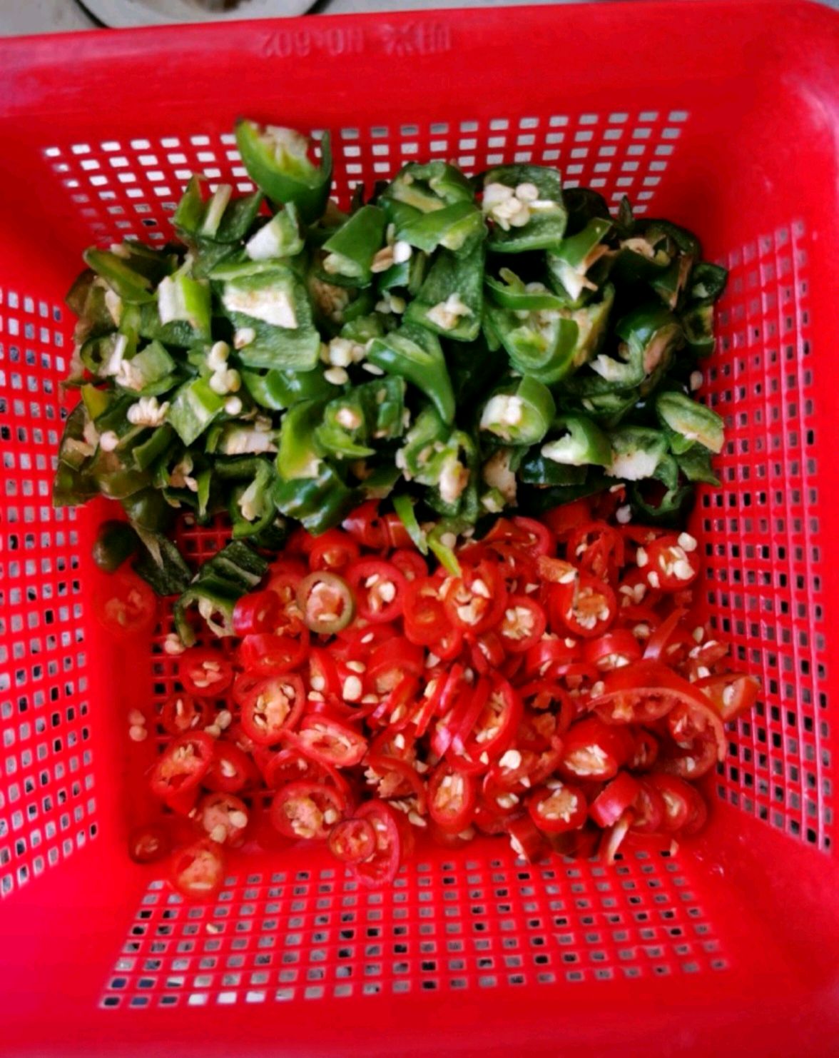辅料:蒜末5克、姜末5克、小米辣8个、小青椒8个