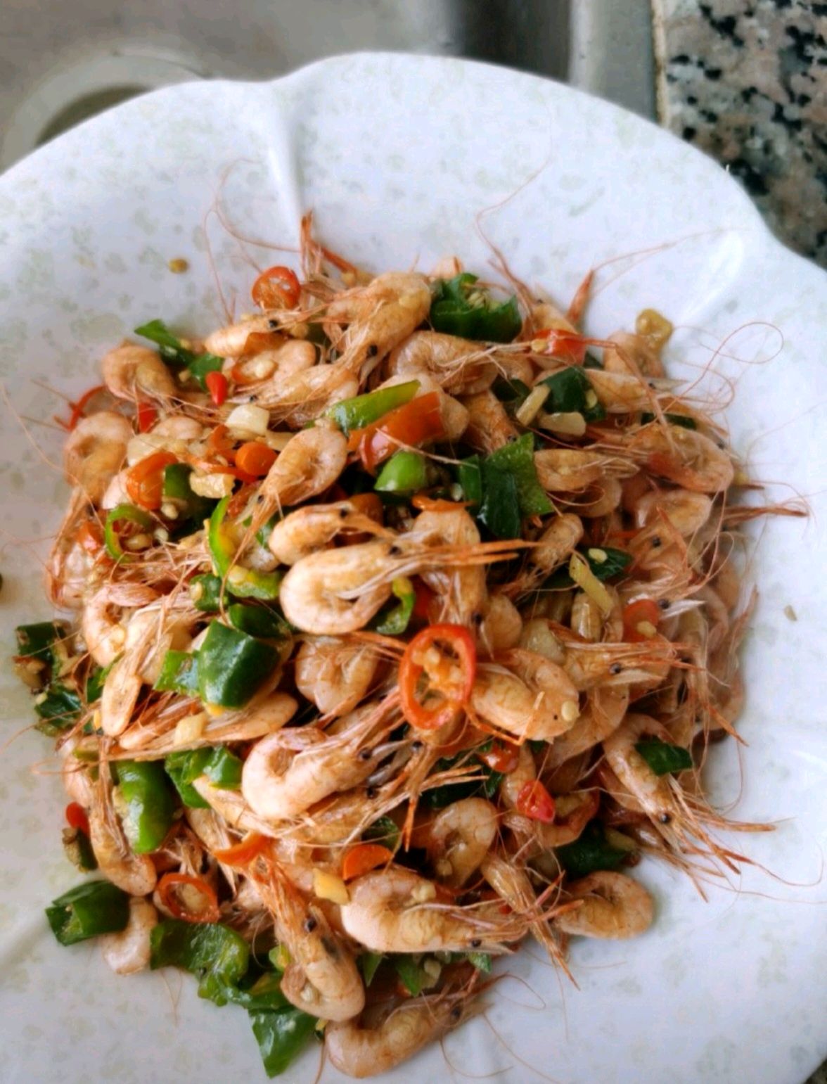步骤5、呛香后下入腌制过的小河虾,大火爆炒至河虾变红,加入少量生抽和盐调味。翻炒均匀即可出锅