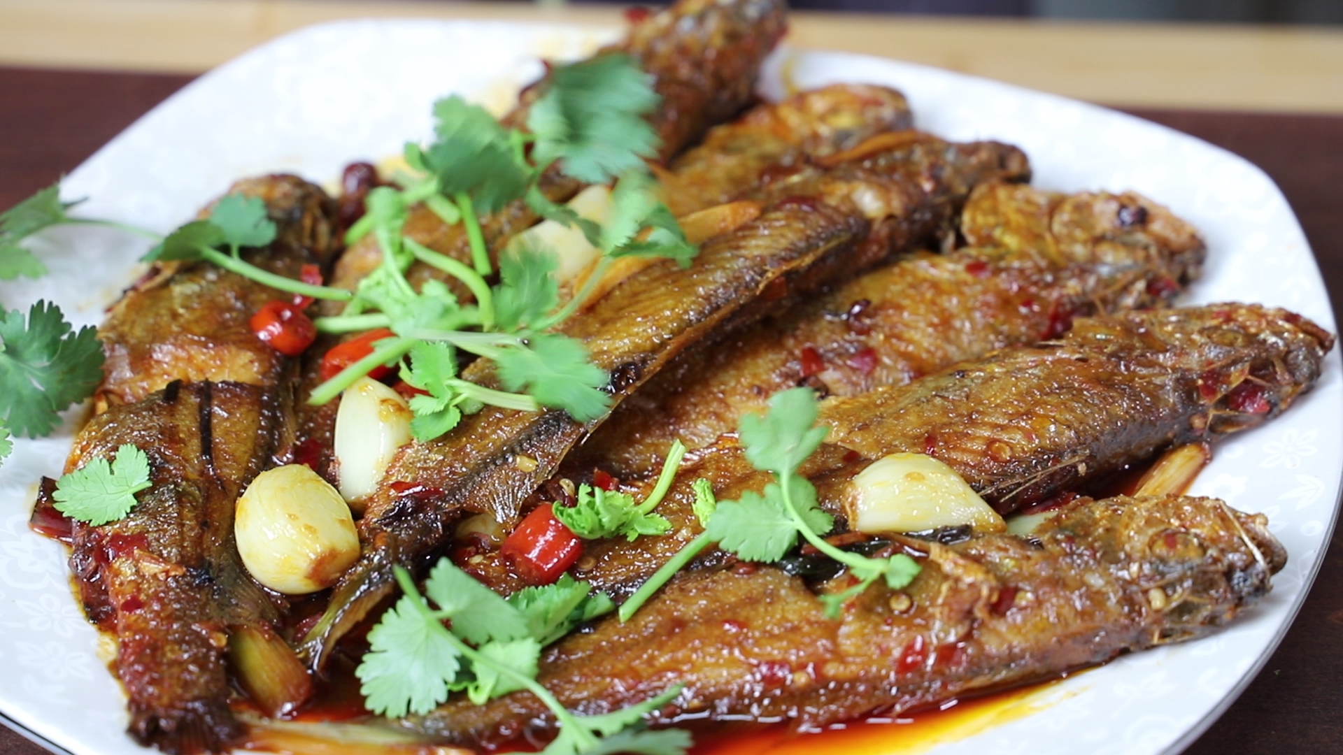 步骤8、下入小黄鱼,放入一把蒜瓣,盖盖烧3-5分钟就可以了