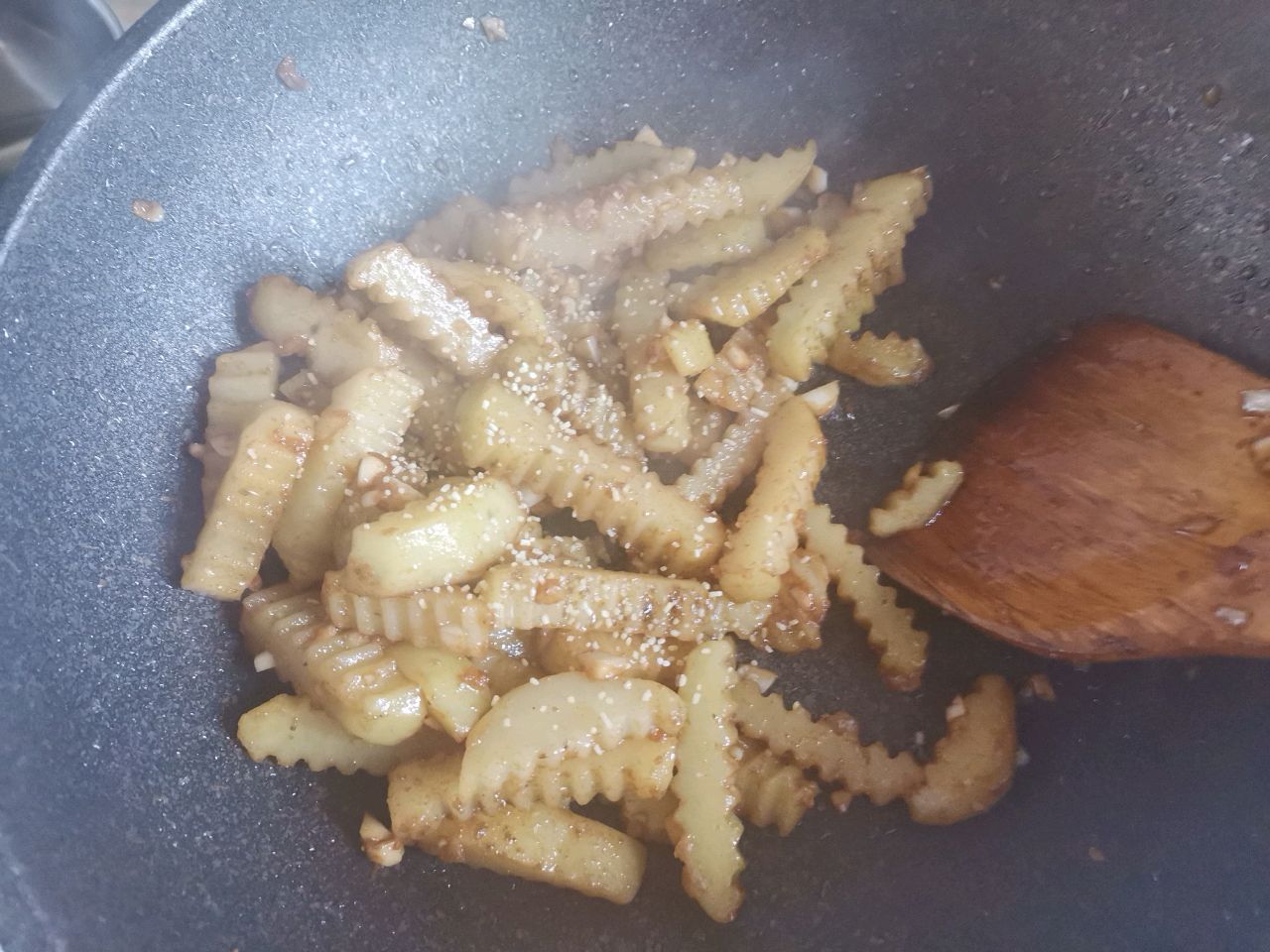 步骤5、起锅烧油,倒入比平时炒菜多一点的油,下入土豆中小火炸至五成熟,捞出控油备用