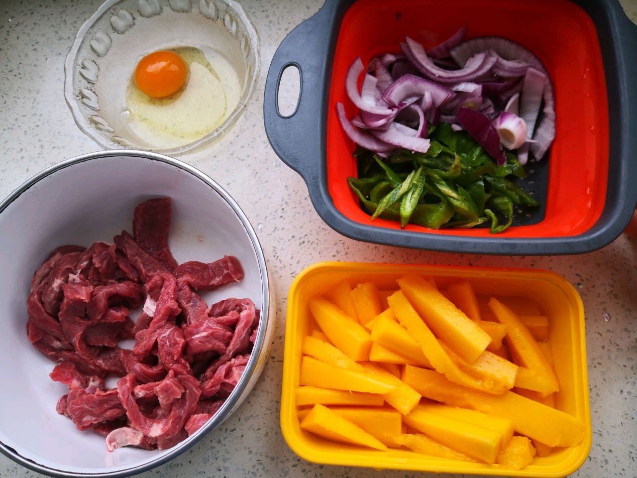 步骤1、牛柳清洗沥干,芒果去皮切条,鸡蛋打散,洋葱和青椒切片。