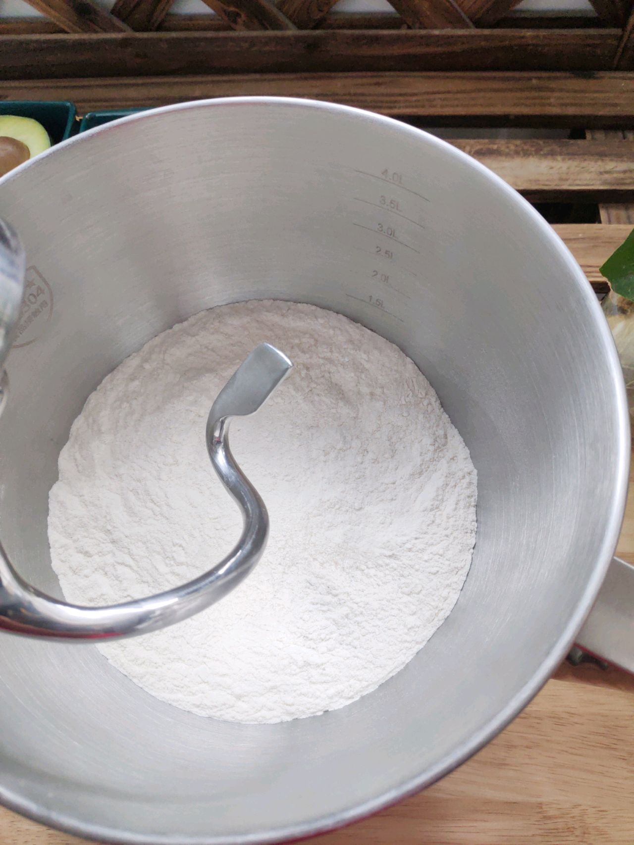 步骤1、先将面粉倒入厨师机的搅拌锅里面,然后放酵母粉和白砂糖,低档先将它们混合均匀之后再放白砂糖,
