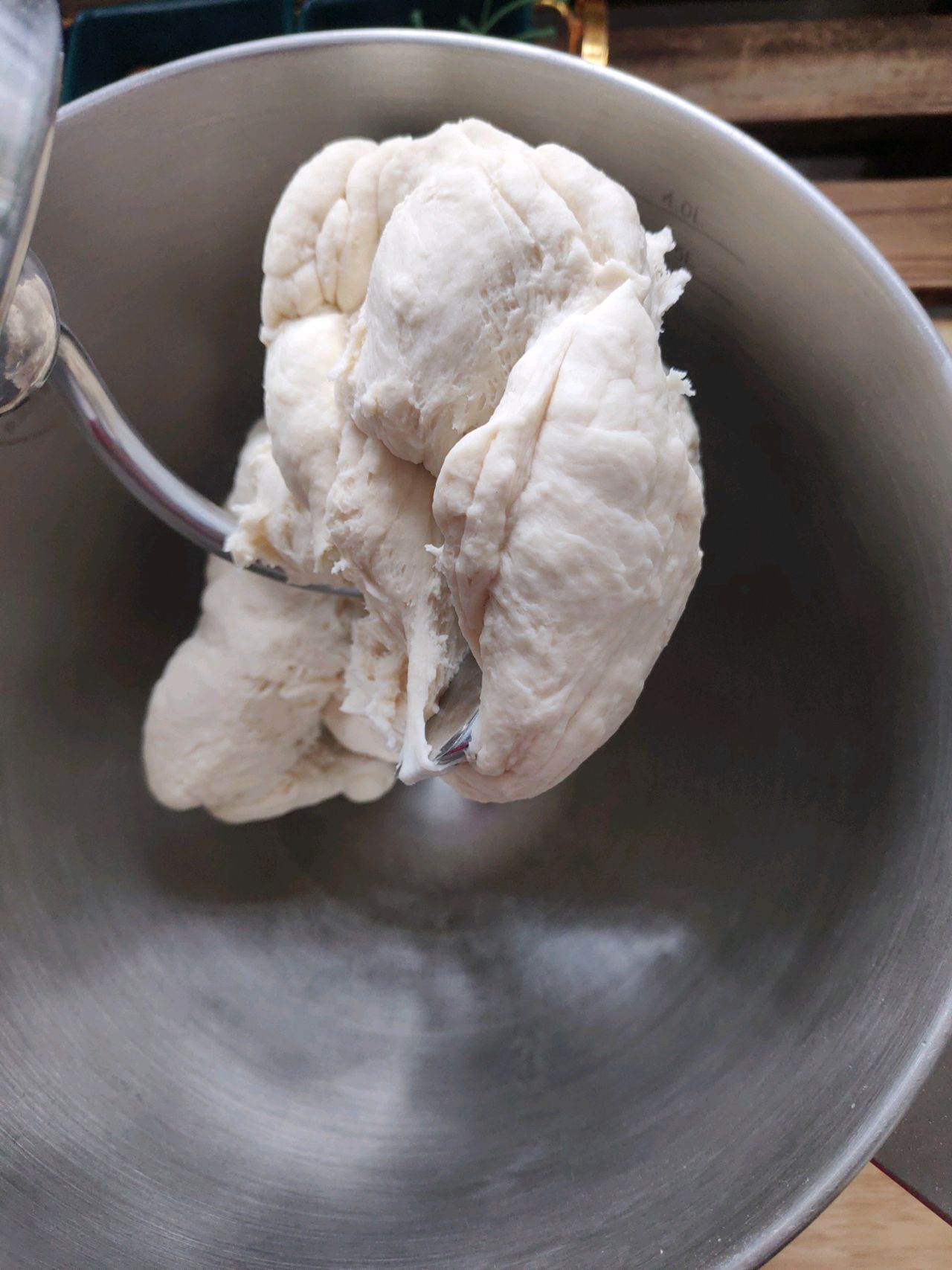 步骤2、最后放入纯牛奶,牛奶边倒入边搅拌。搅拌成絮状之后开二档,继续搅拌成团