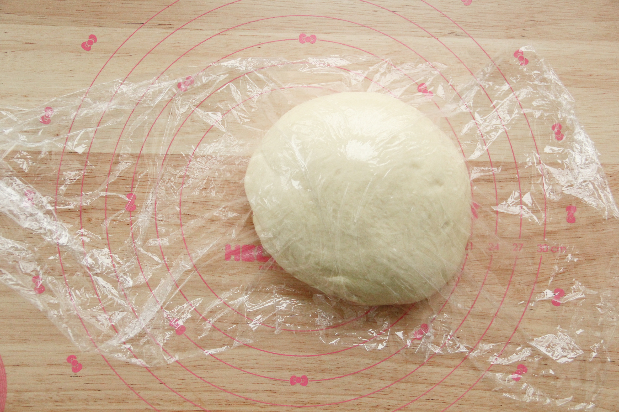 步骤6、折叠按压排气,双手握住面团,逆时针滚圆后盖上保鲜膜,松弛15分钟。