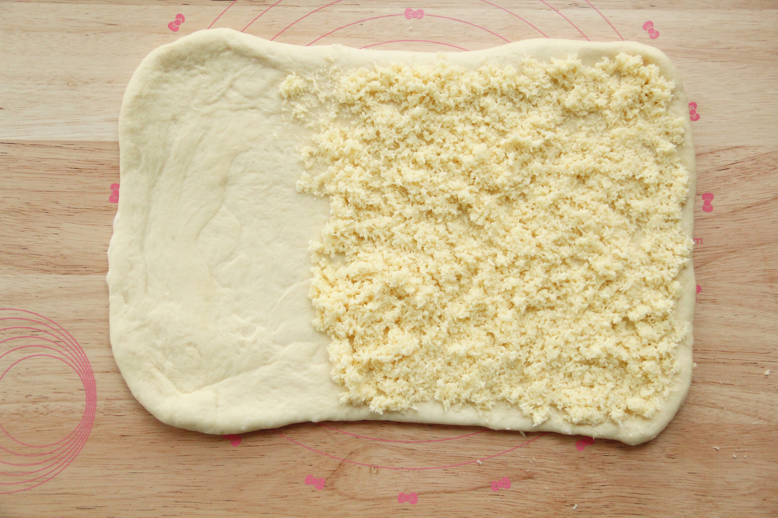 步骤7、松弛好的面团,擀开成长方形,长40公分,宽20公分左右,翻面,整理。在2/3处铺上椰蓉奶酥馅料。
