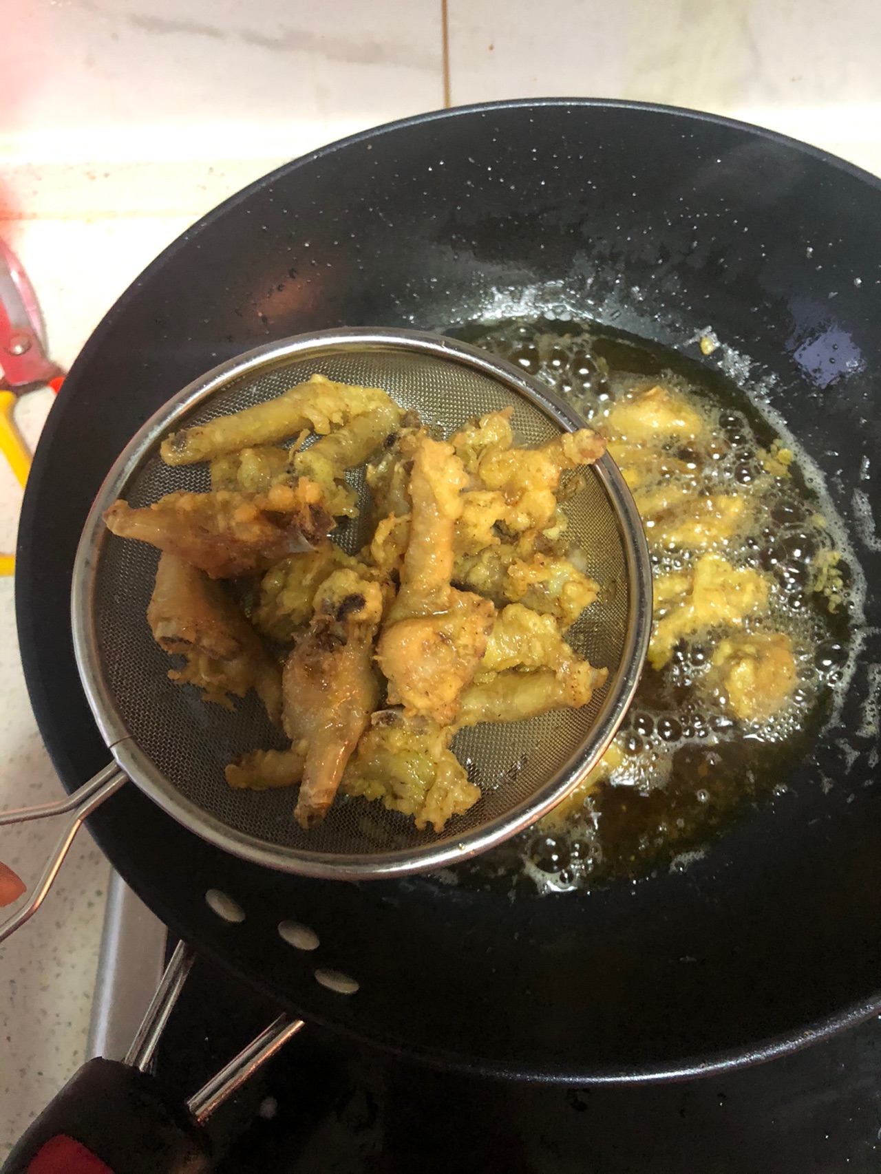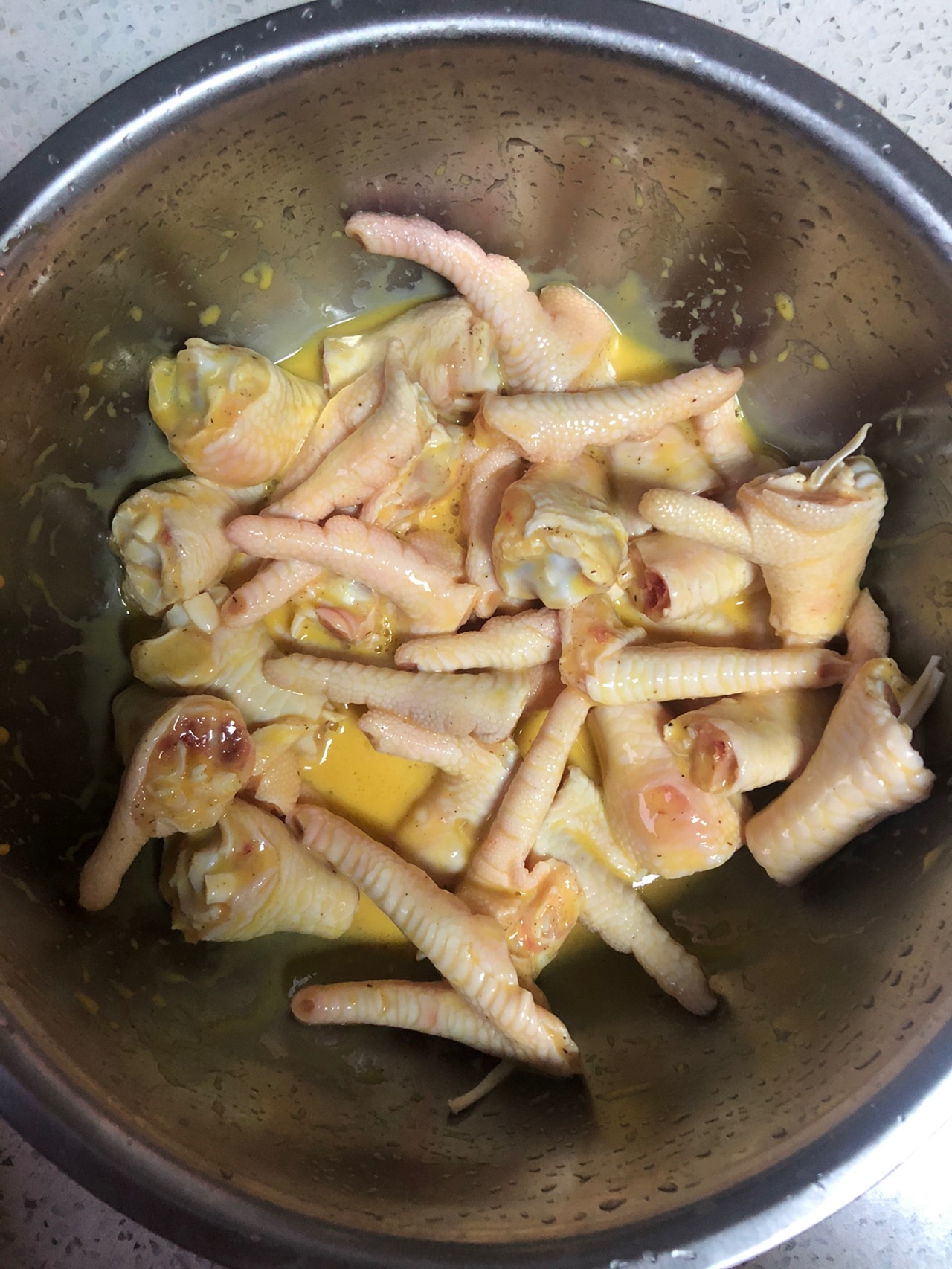 步骤4、倒入蛋糊搅拌均匀,油温6成热下入鸡爪进行油炸