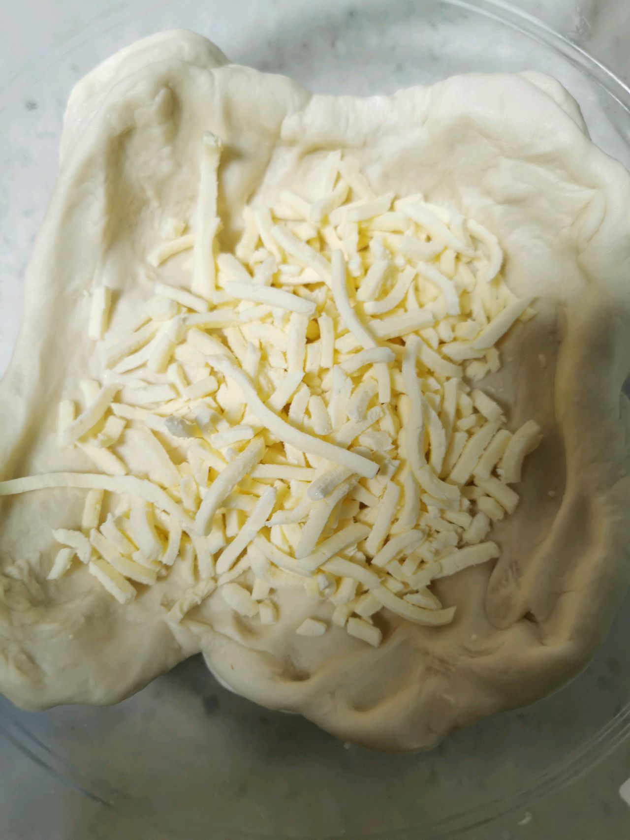 步骤6、将面团压扁摊开加入芝士碎,揉匀即可