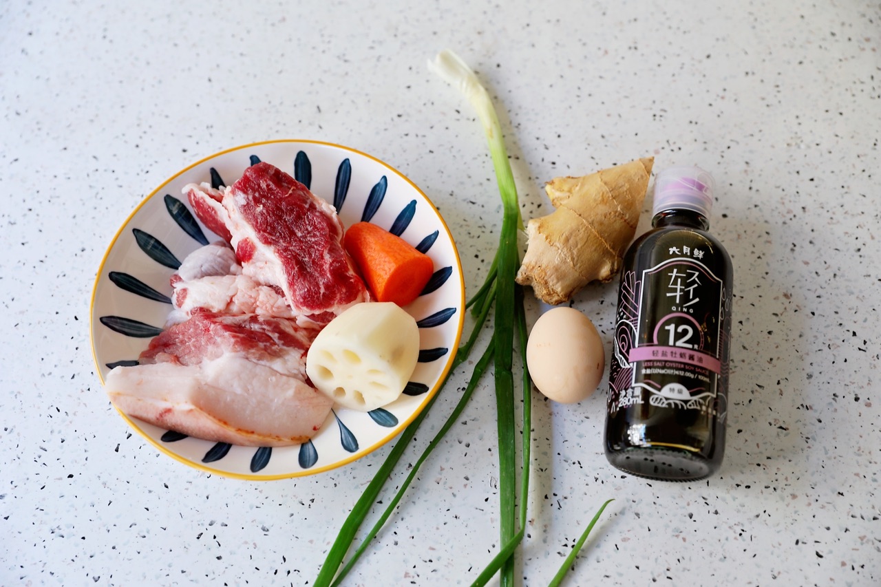辅料:莲藕60克、姜10克、葱10克、鸡蛋1个、玉米淀粉20克、胡椒粉2克、花椒粉1克、六月鲜12克轻盐牡蛎酱油1勺、食用油(炸肉丸)适量