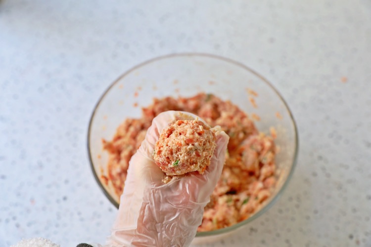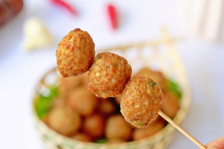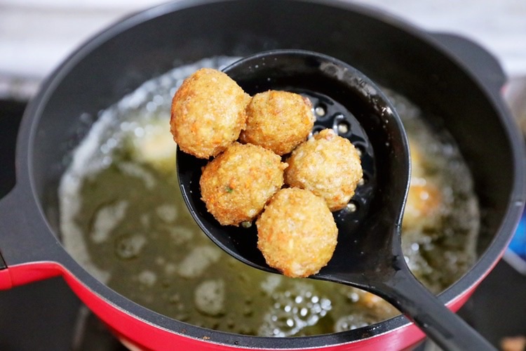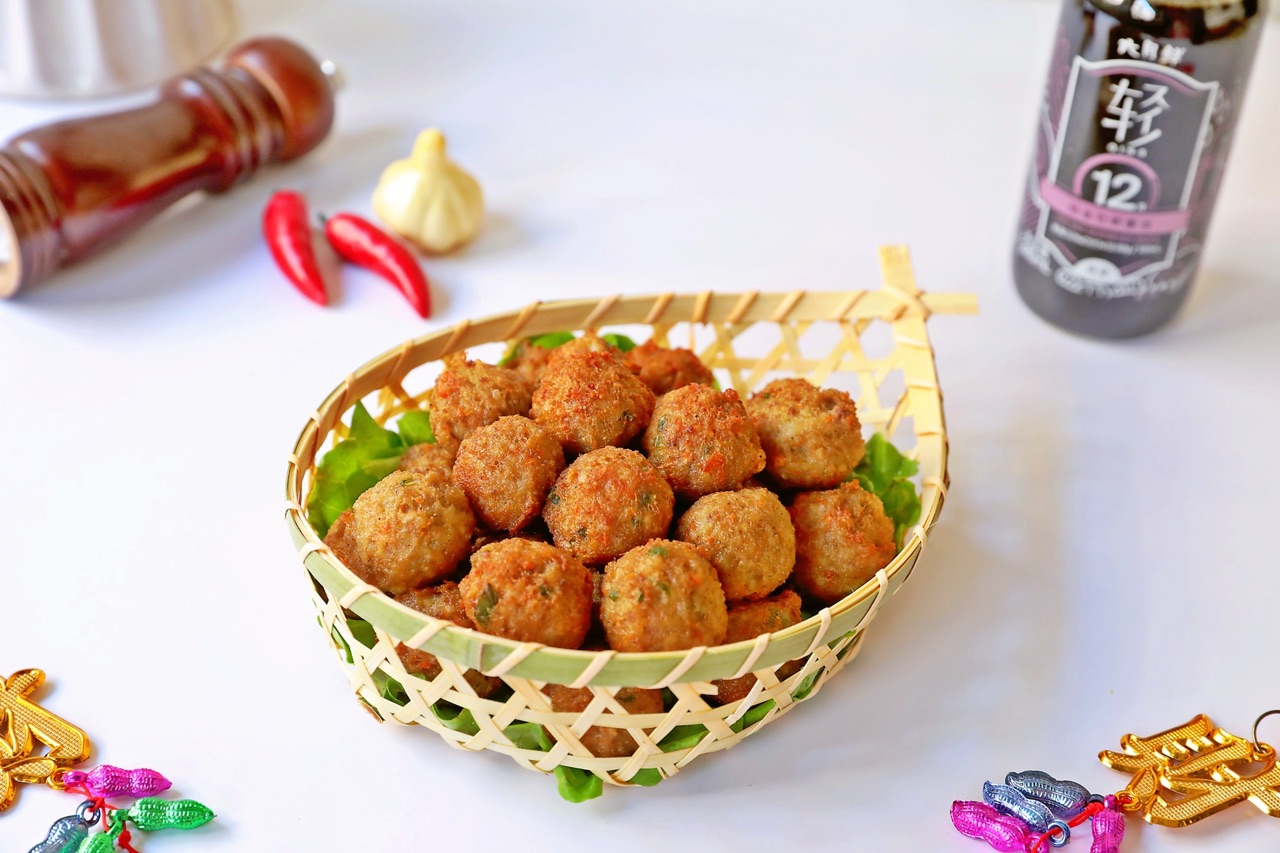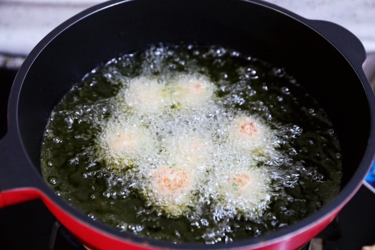 步骤10、油温五六成热时放入丸子,小火炸至金黄色