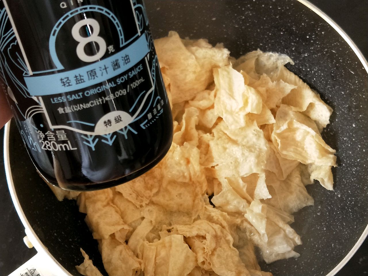 步骤4、锅里倒入适量花生油,倒入腐竹,翻炒片刻。