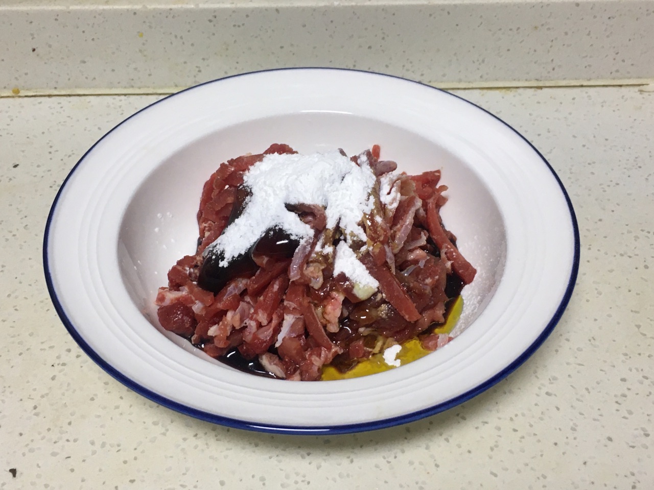步骤2、将牛肉提前腌制入味,减少烹饪时间,避免牛肉炒老,牛肉中倒入1勺食用油、1勺味达美味极鲜酱油、1勺味达美醇鲜蚝油、1勺味达美臻品料酒、1勺生粉;
