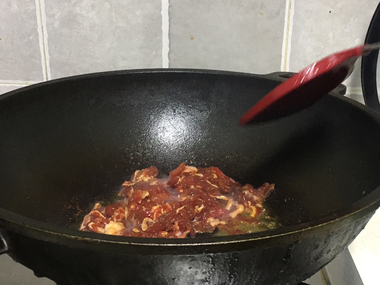 步骤4、锅内倒入适量食用油,油热后倒入牛肉丝,快速煸炒;
