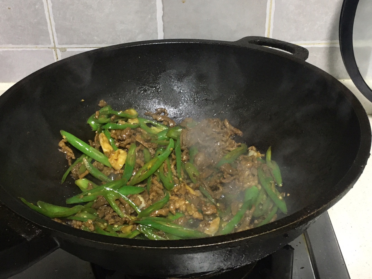 步骤1、将牛肉稍微清洗干净,然后切成细条,而青椒则切成斜刀块,大蒜先拍扁再切碎;