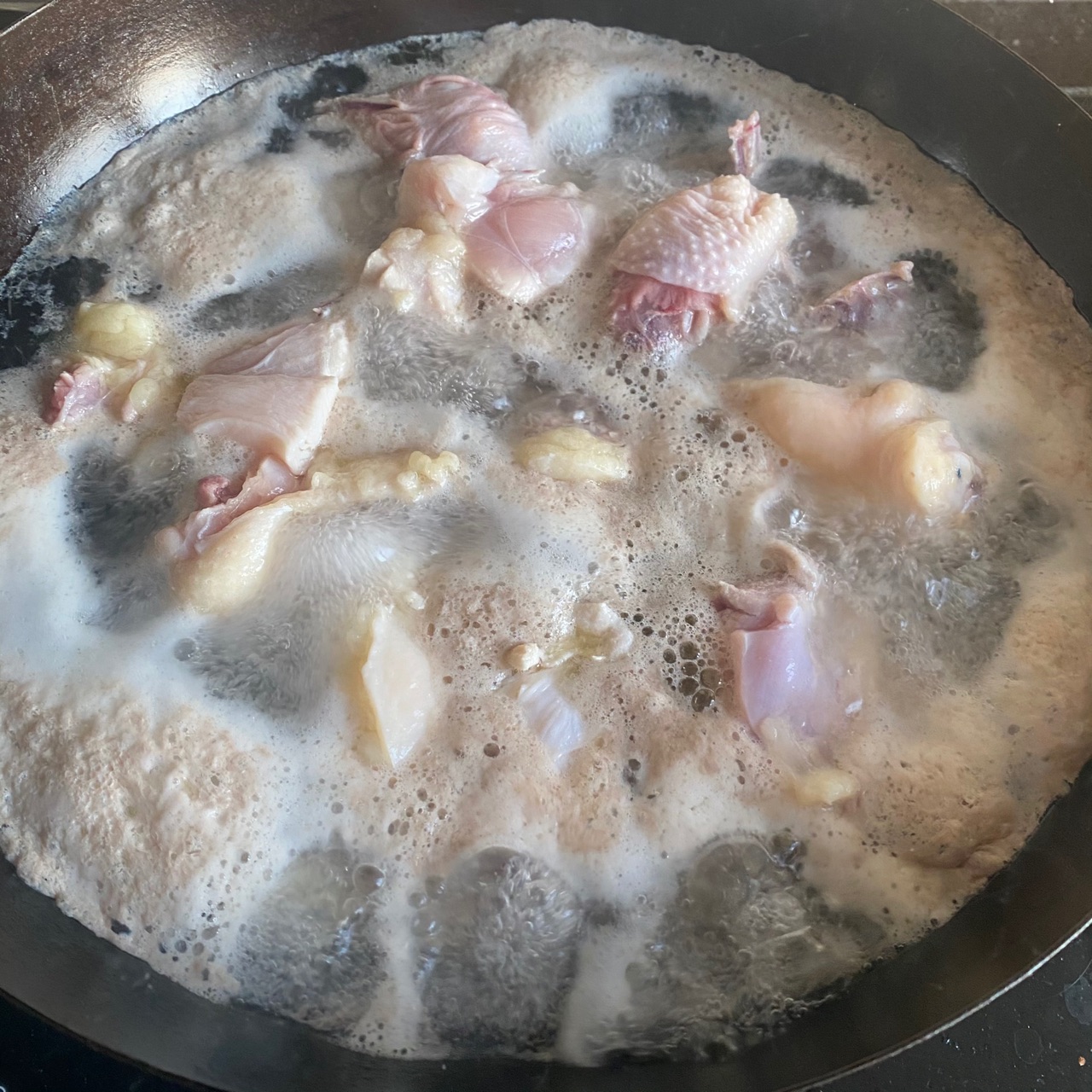 步骤3、鸡块汆水煮出血沫,再把血沫撇出去