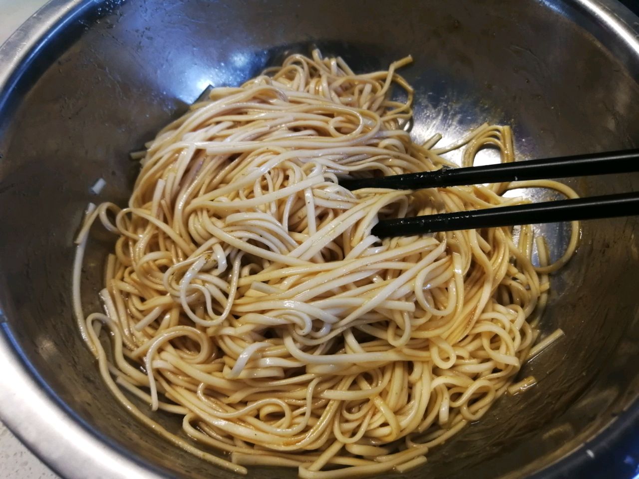 步骤5、平底锅中倒入比炒菜多一点的油,将面条尽可能的摊薄,量多可分次煎炸,中小火煎炸。