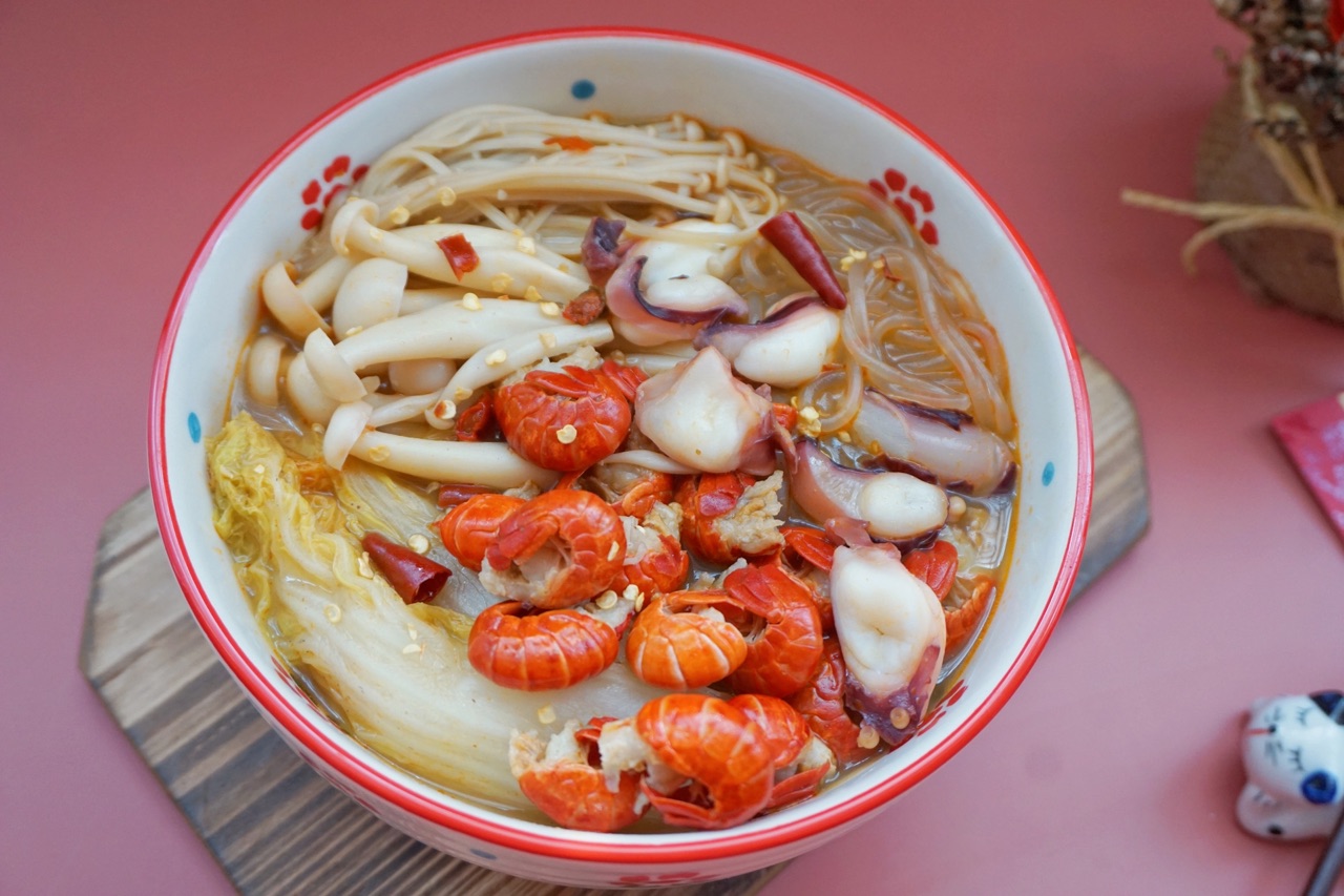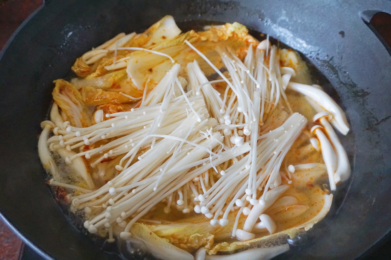 辅料:山药粉条150克、娃娃菜1颗、白玉菇100克、金针菇100克、味达美臻品特级生抽2大勺、味达美臻品料酒1中勺、牛油火锅底料30克、清水500克