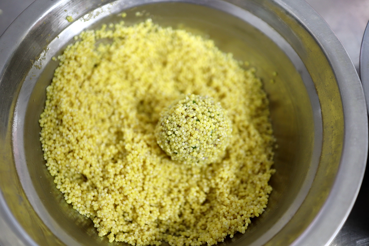 步骤7、肉丸在小米中滚几圈,裹满小米,用手再轻轻按压结实;