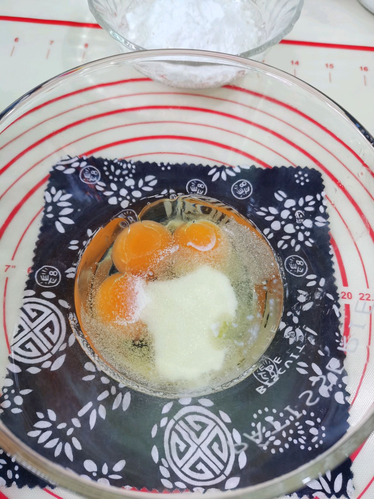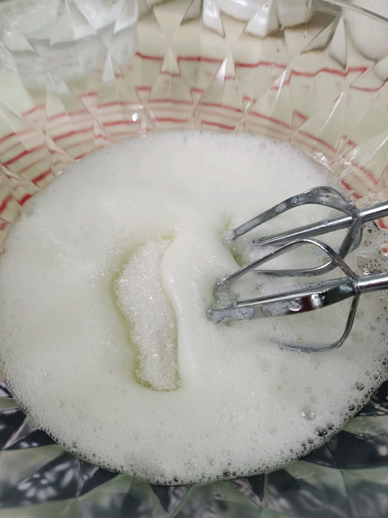 步骤1、鸡蛋分离蛋黄,蛋清。蛋黄里加入奶粉+水,糖20g,油30g