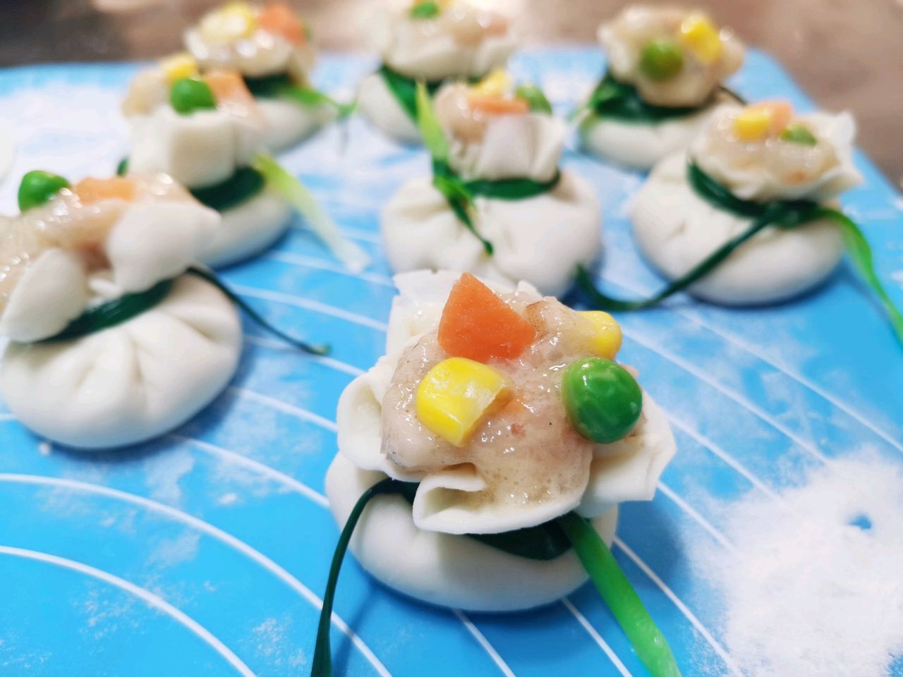 步骤7、饺子皮包入肉馅,不封口,用焯过水的韭菜系一下,加一点点缀。