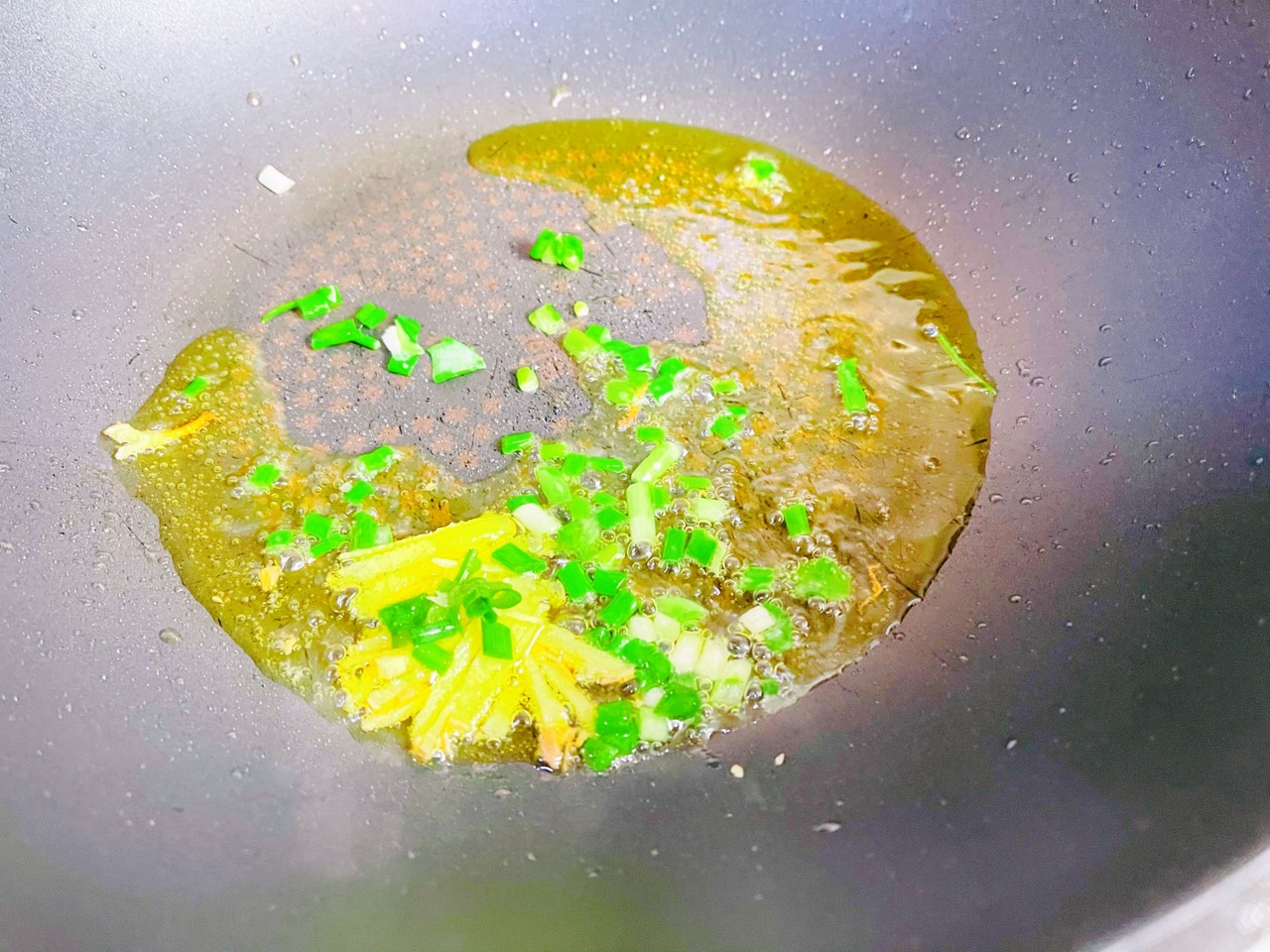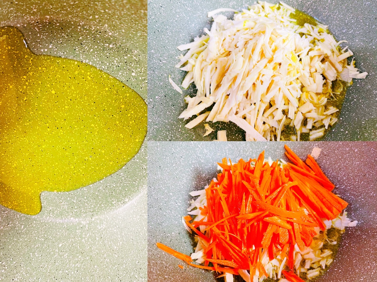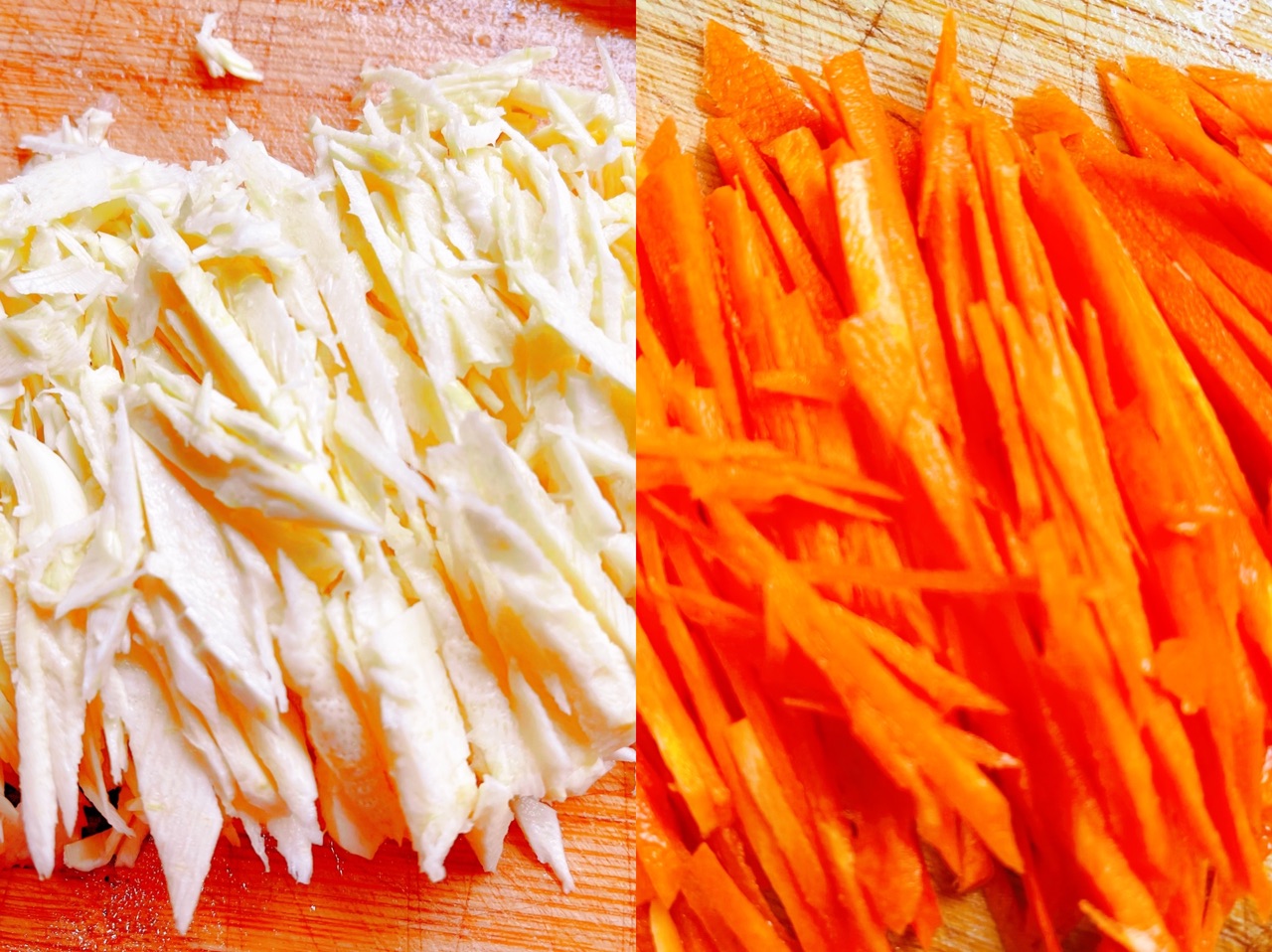 步骤10、下油煸炒冬笋和胡萝卜丝