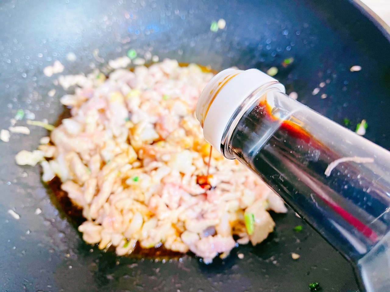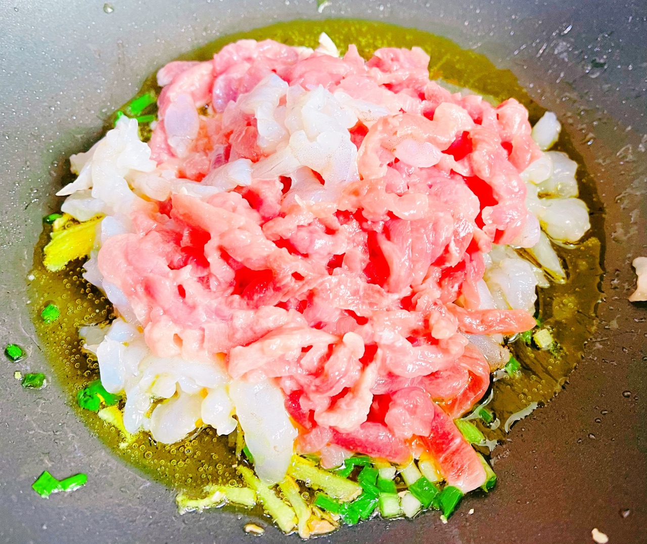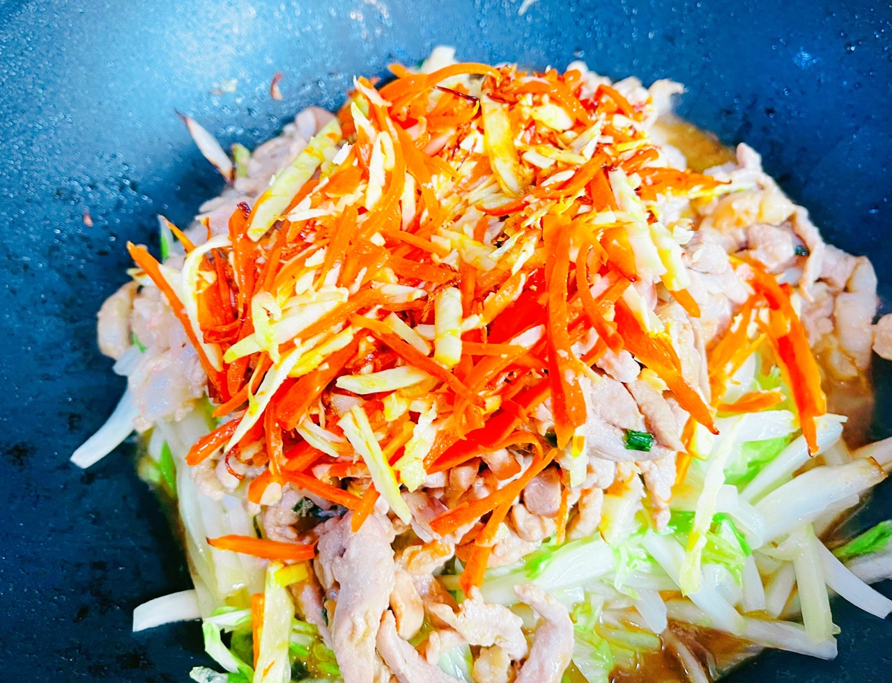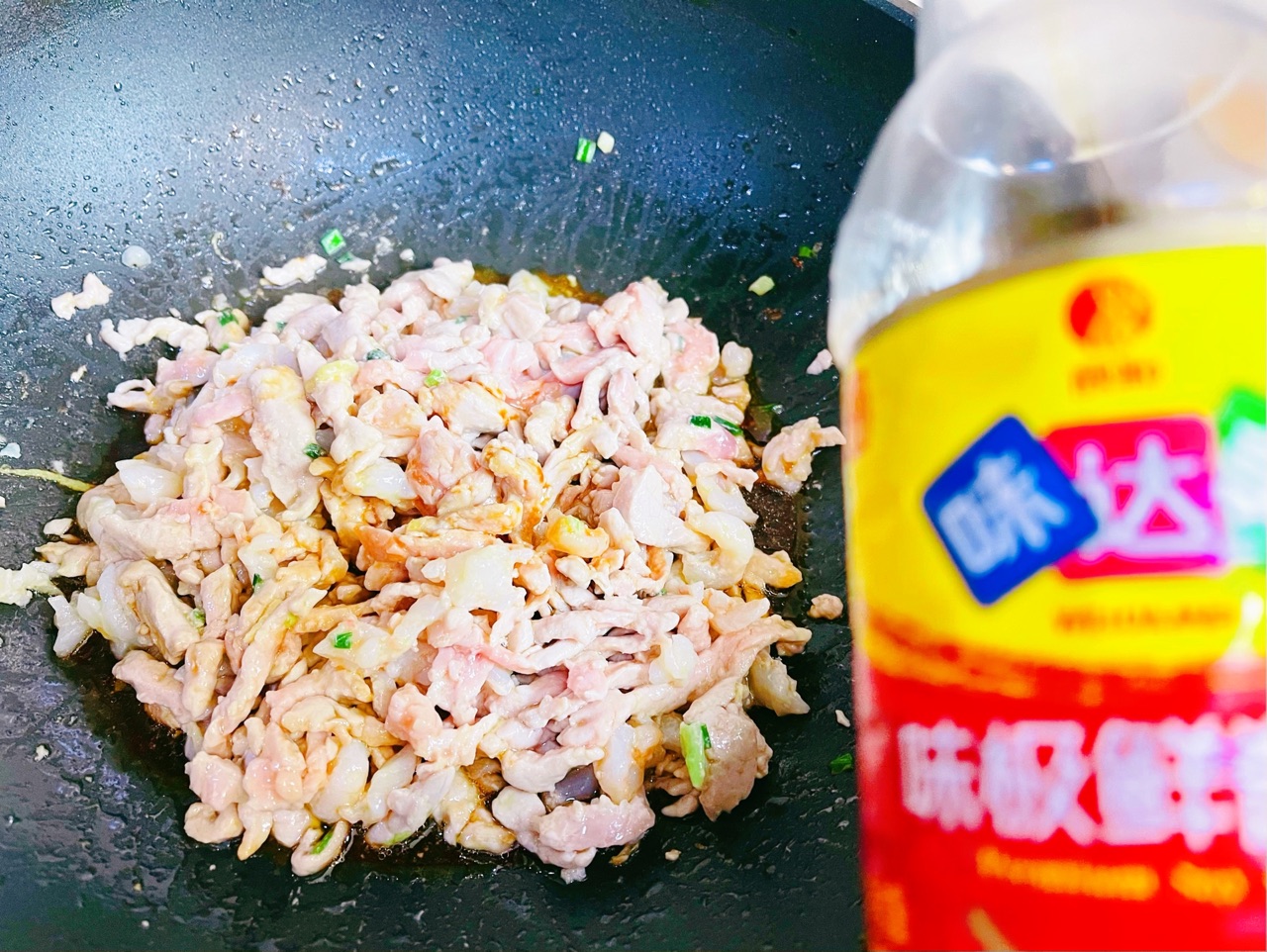 步骤14、再下备肉丝冬笋胡罗卜丝,加入六月鲜一勺