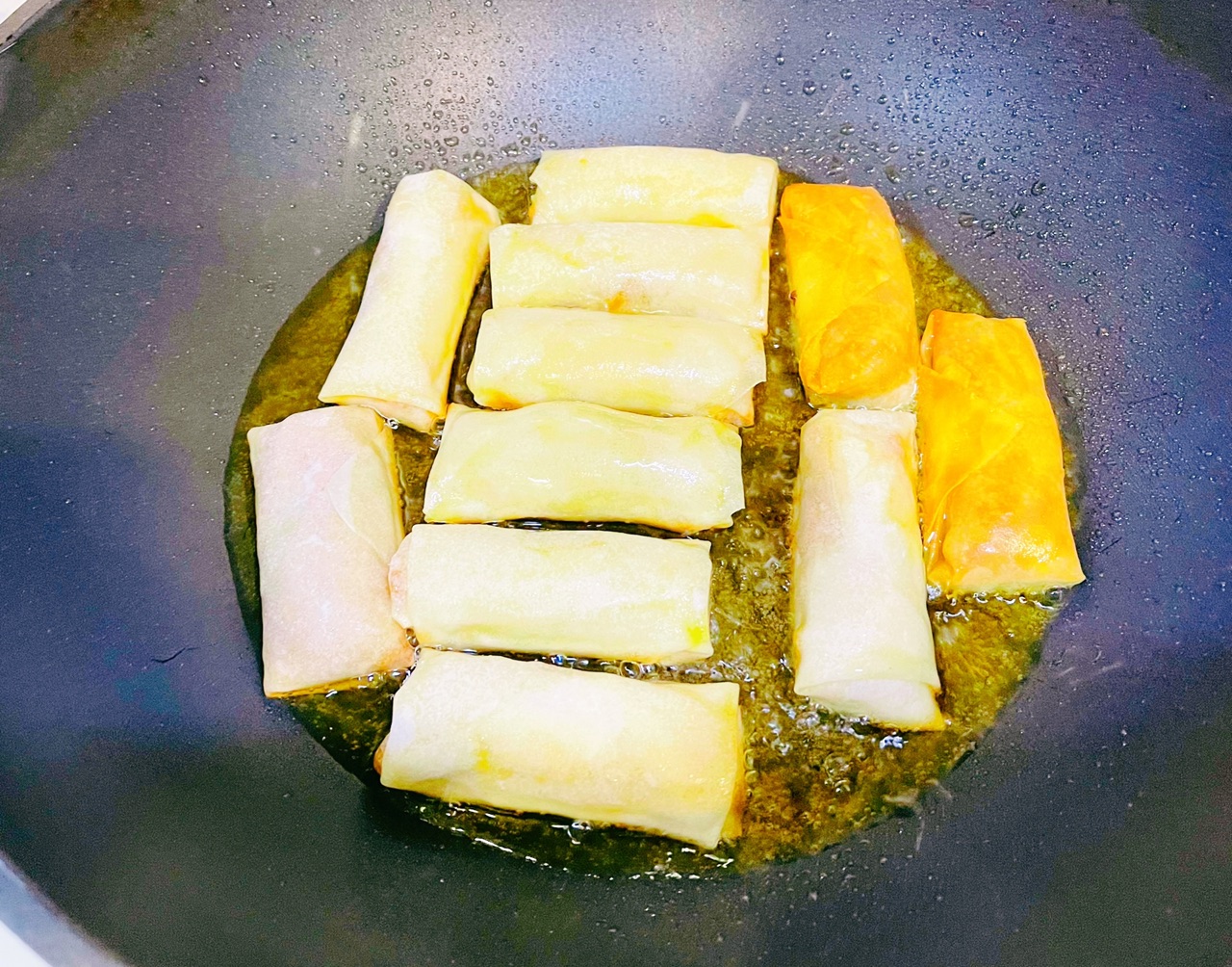 步骤19、一盘春卷好了,上桌开吃,蘸醋吃味更好