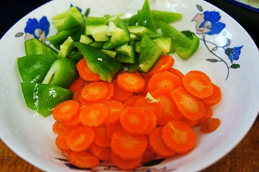 步骤3、青椒切块,胡萝卜切片,切成什么样的形状随个人喜欢哈。
