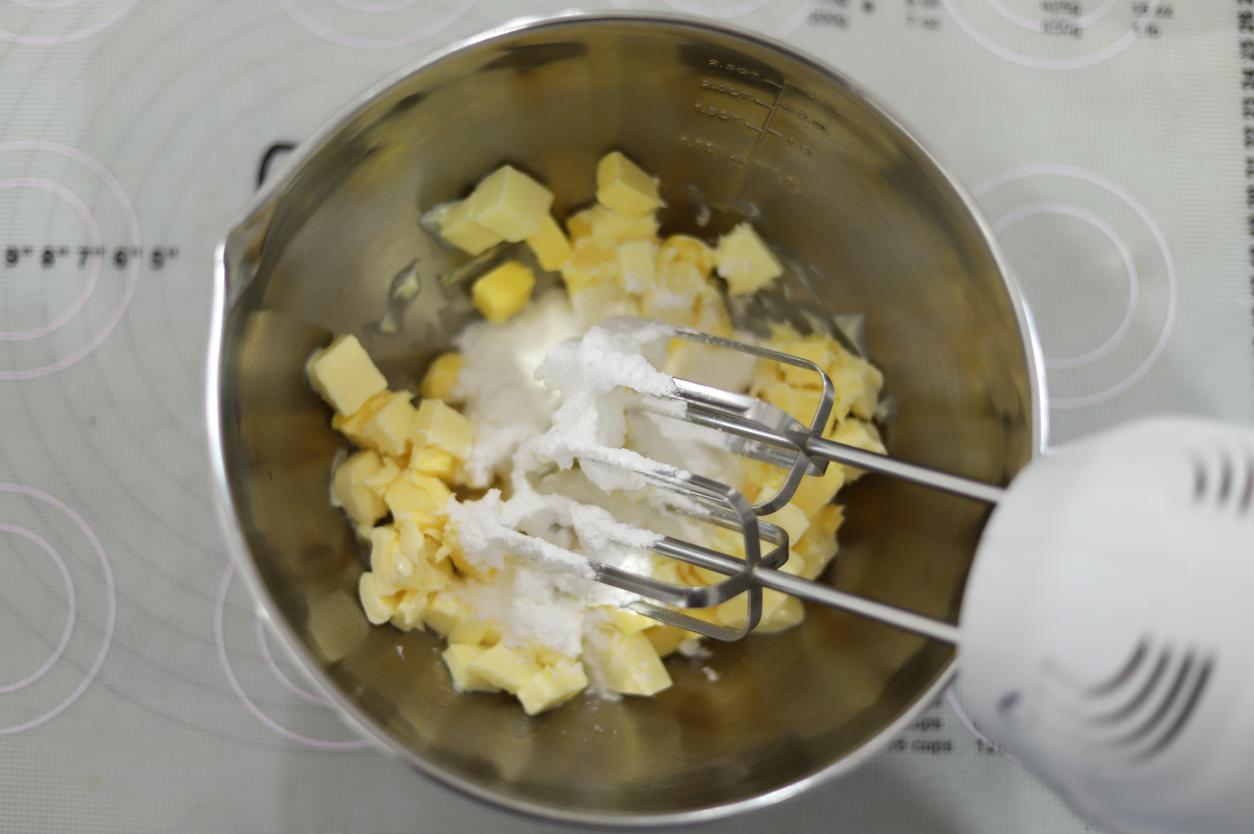 步骤1、黄油切成小块,夏天室温软化,冬天可以借助烤箱发酵32度软化。