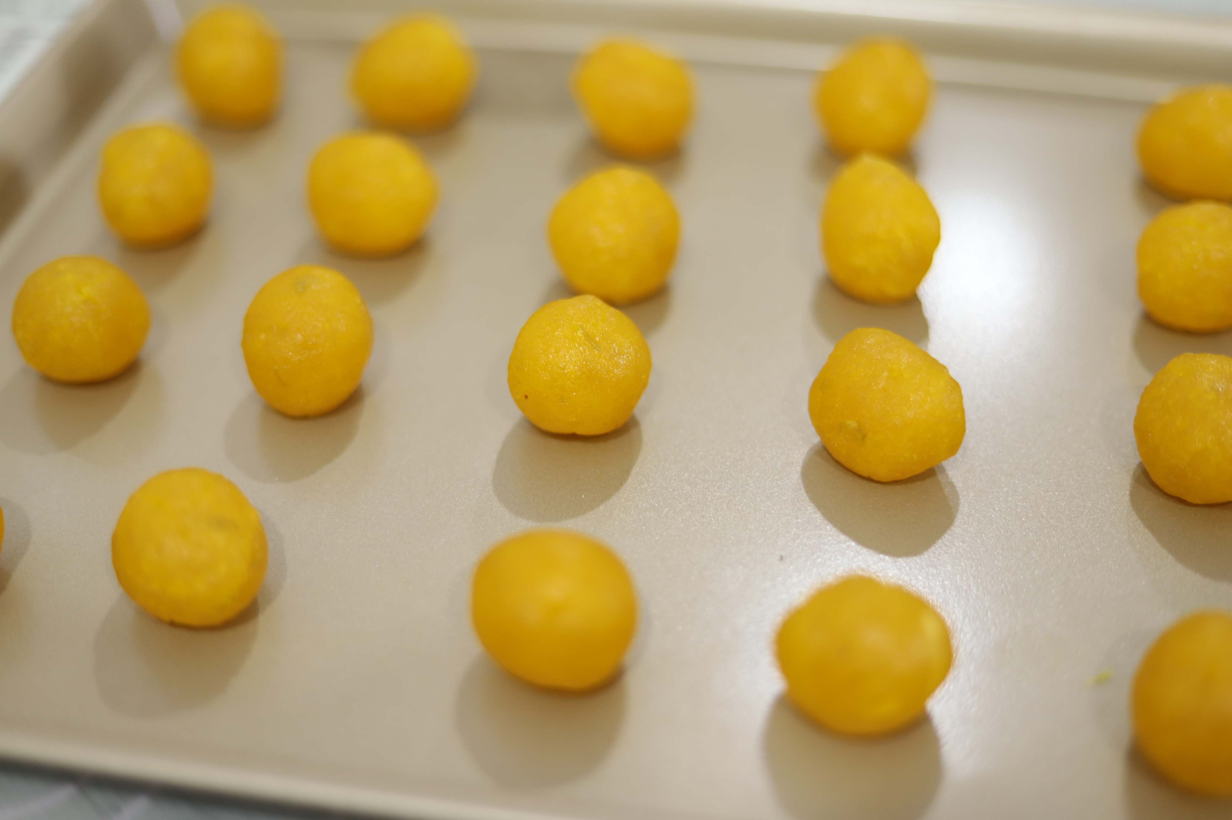 步骤11、做好的凤梨酥面团放入千万两的凤梨模内,稍微用力压好,往上推出,放在烤盘上(记得用力要均匀)。