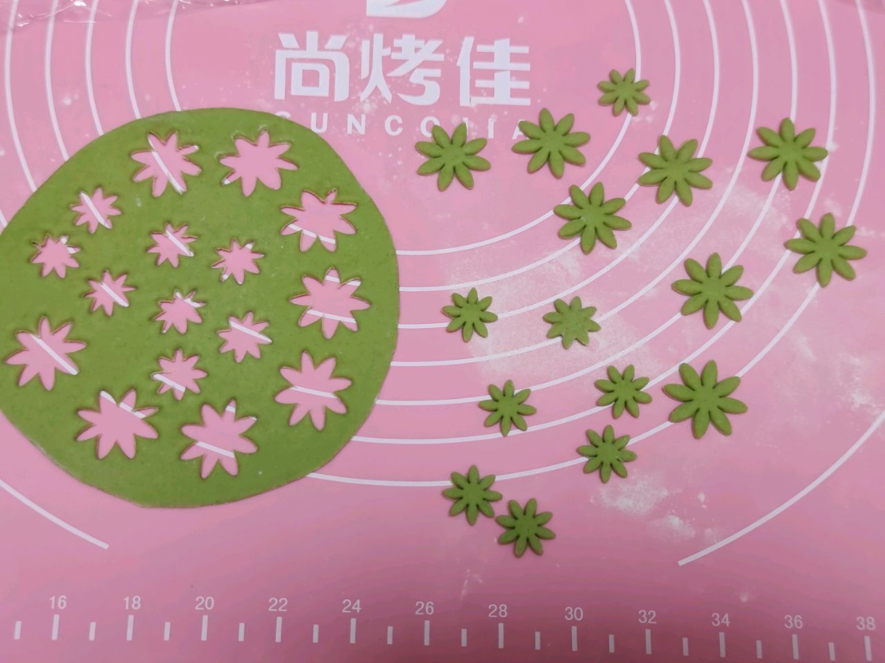 步骤9、将两个颜色另外的30克面团擀好后刻成自己喜欢的样子