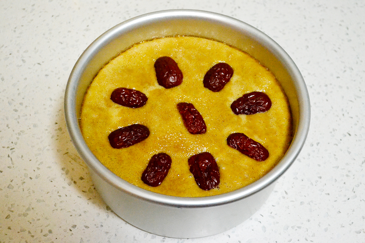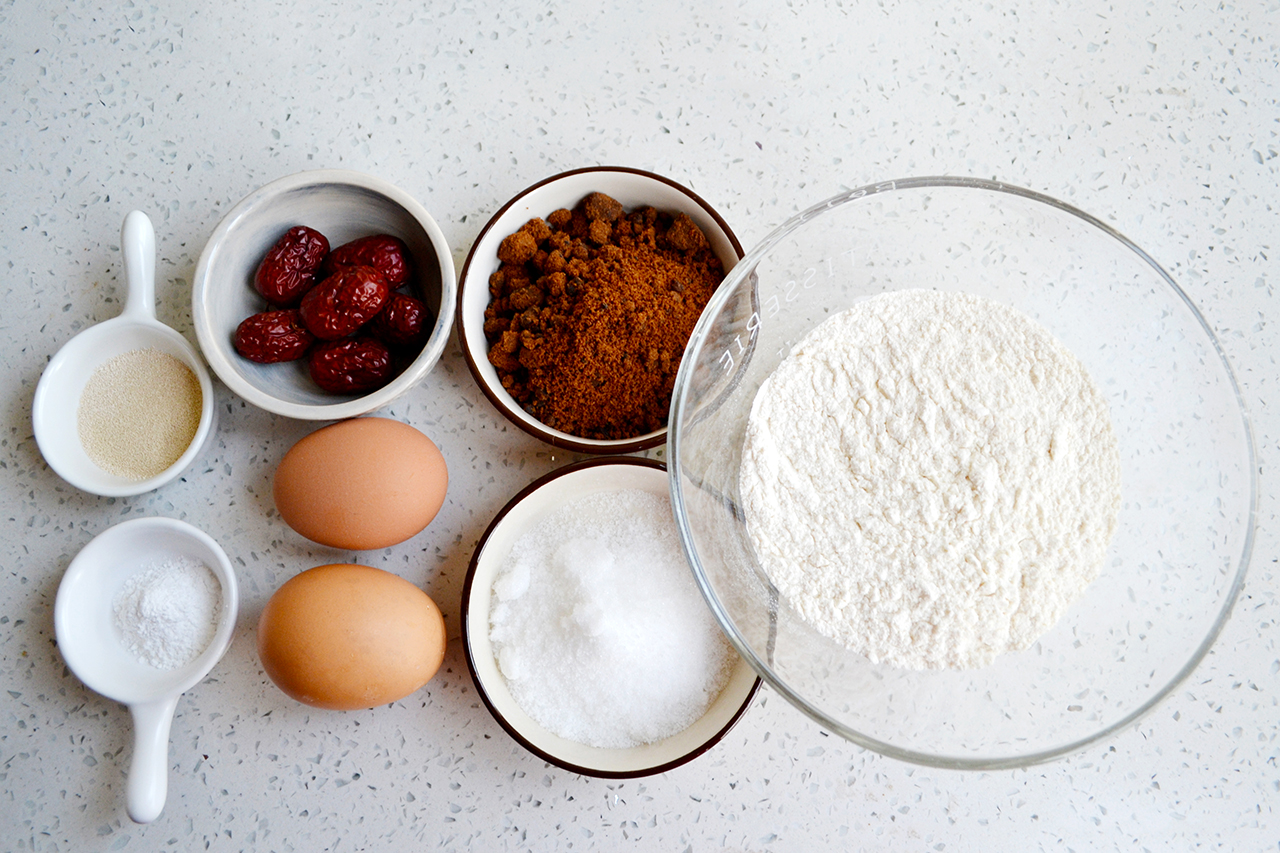 辅料:温水(酵母用)30g、面粉200g、泡打粉2g、鸡蛋2个、白砂糖30g、红枣适量、温水(红糖用)140g