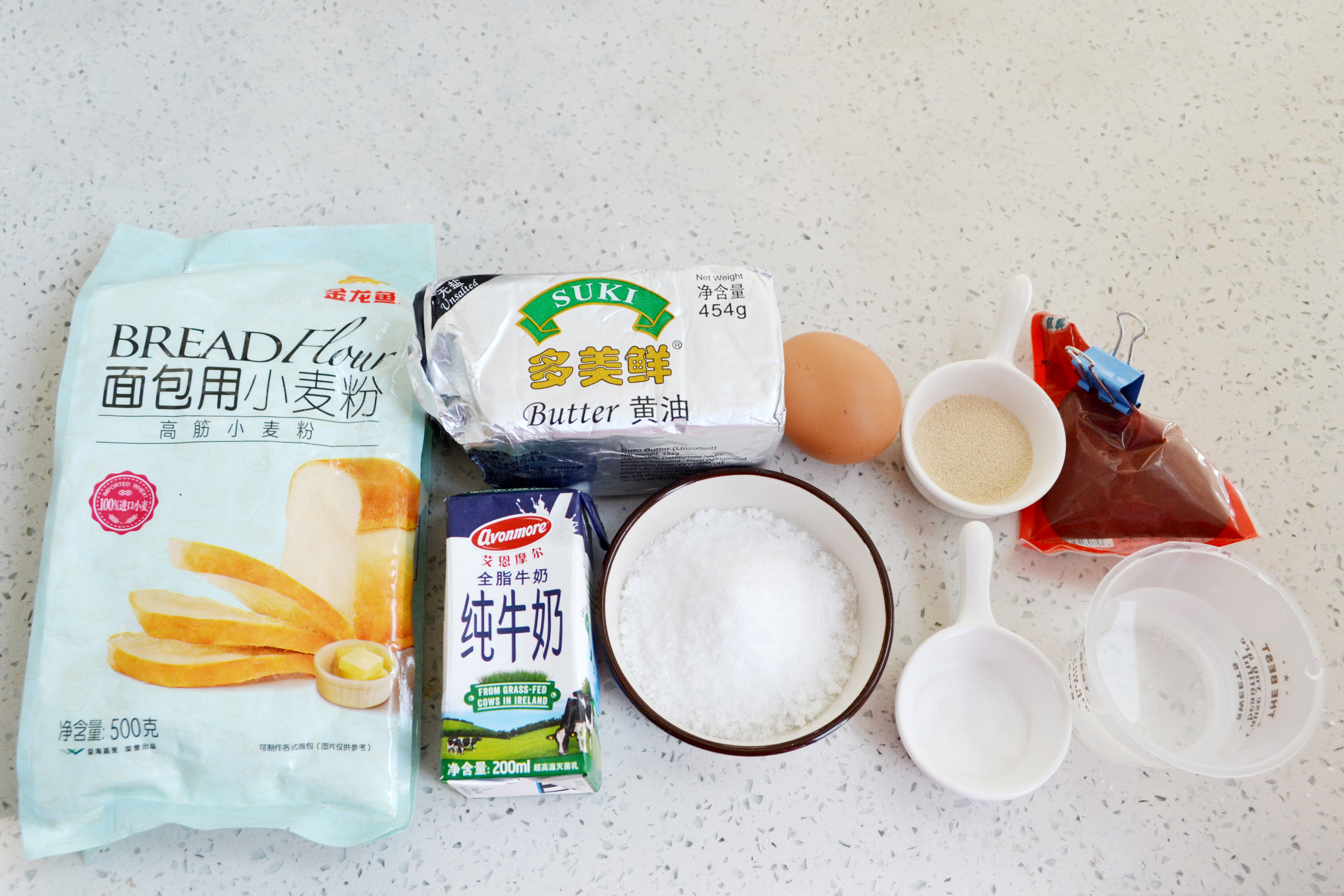 辅料:全蛋液45克、奶粉8克、牛奶100克、糖40克、黄油30克、红曲粉2克、盐3克、水20克