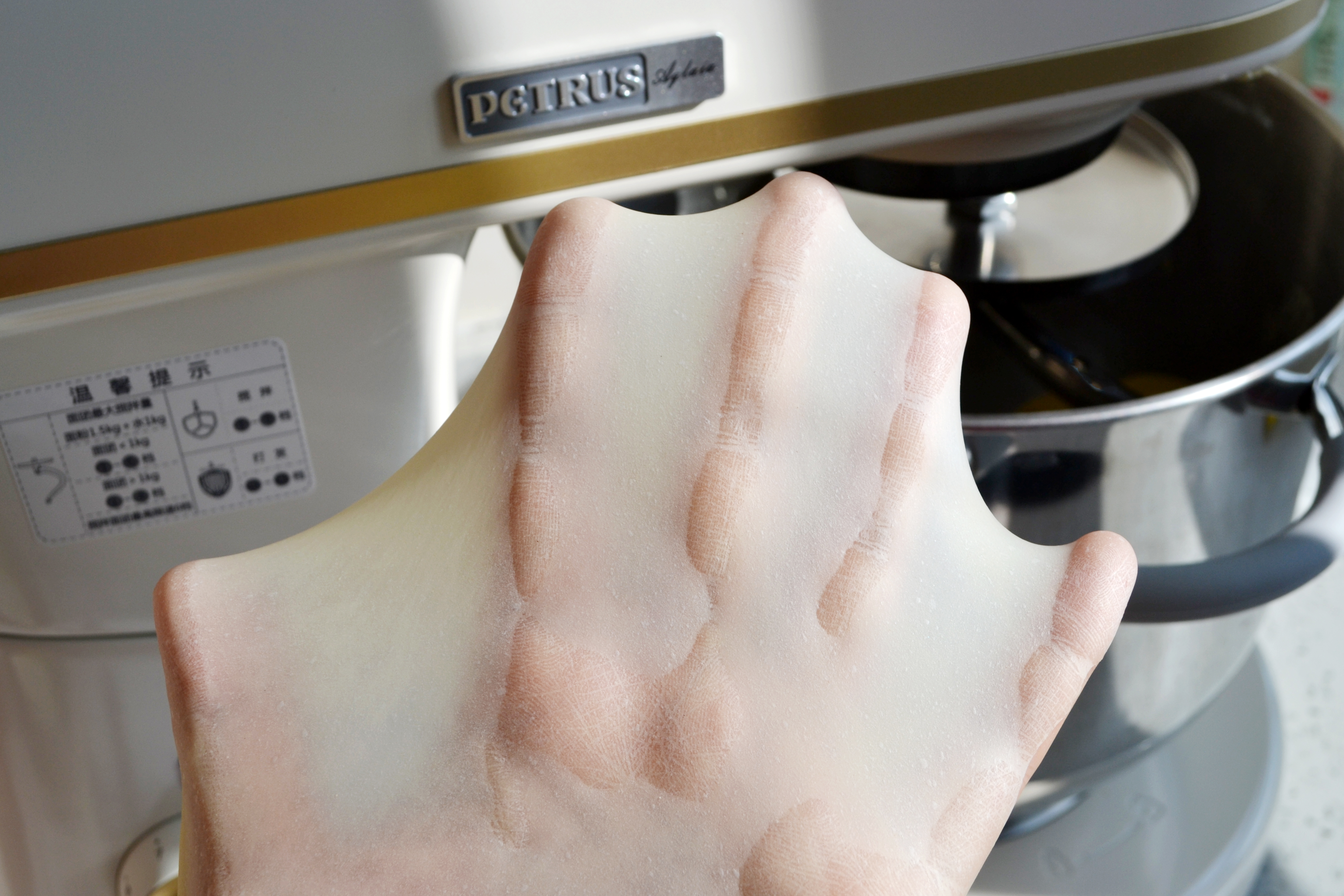 步骤3、再加入软化好的黄油揉至扩展阶段。