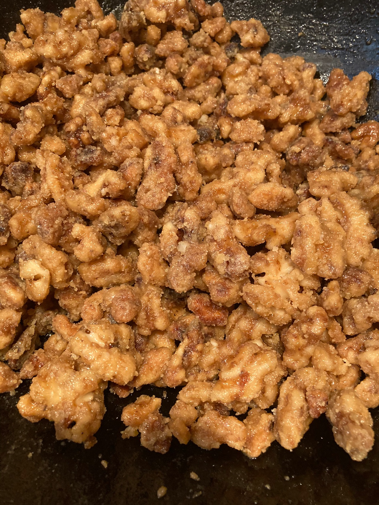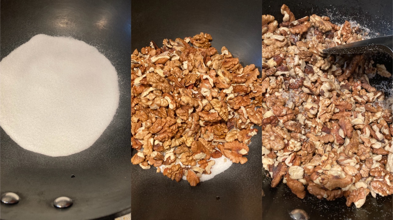 步骤7、核桃仁倒入,翻炒,让每个核桃仁都裹上糖,等糖凝固在核桃仁表面就可以关火了。