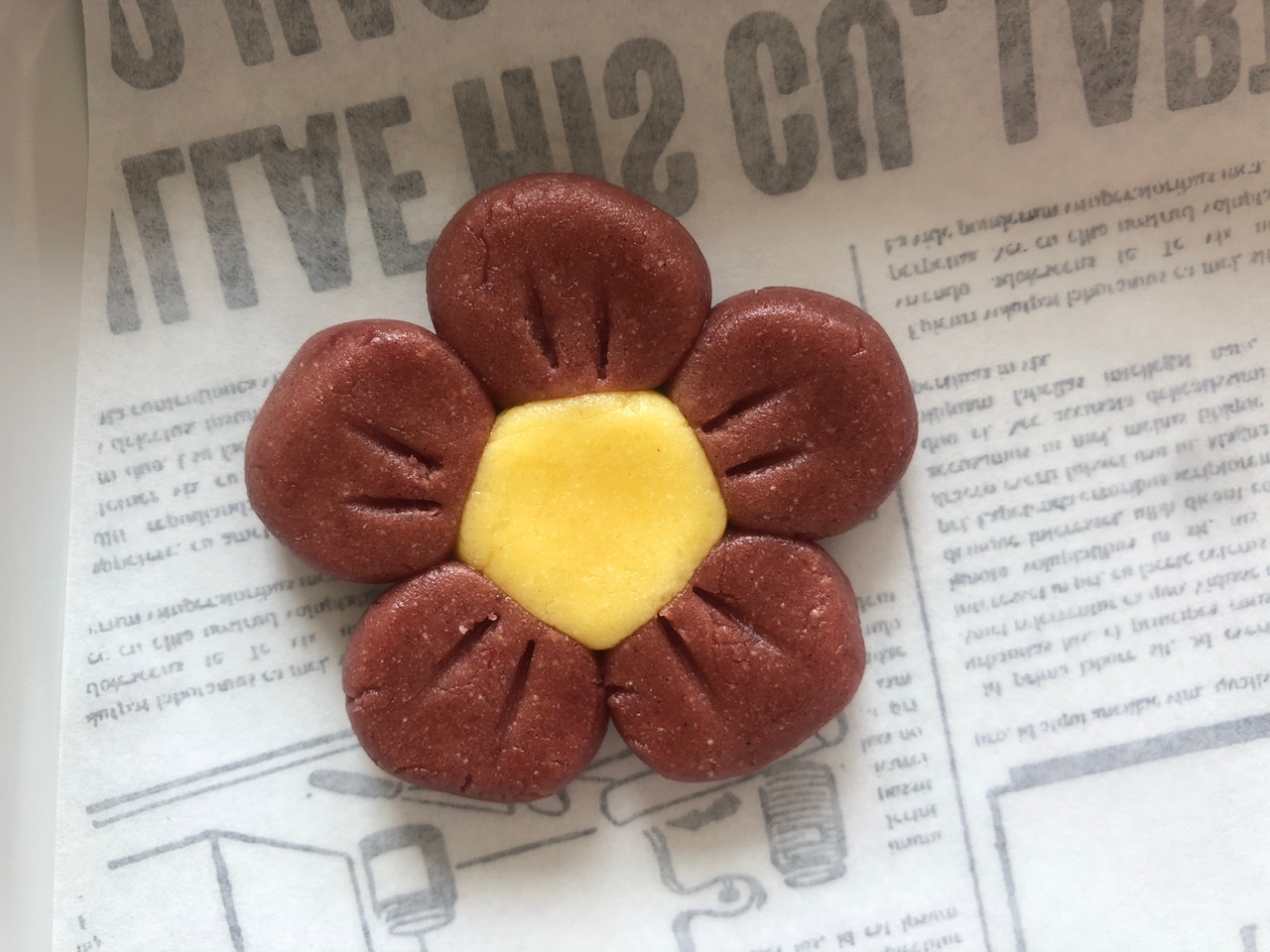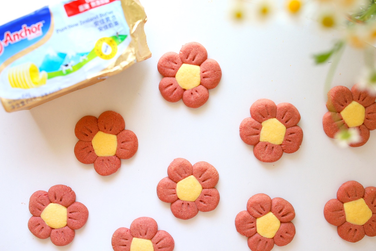 辅料:黄油100克、蛋黄液50克、红曲粉3克、盐2克、奶粉10克