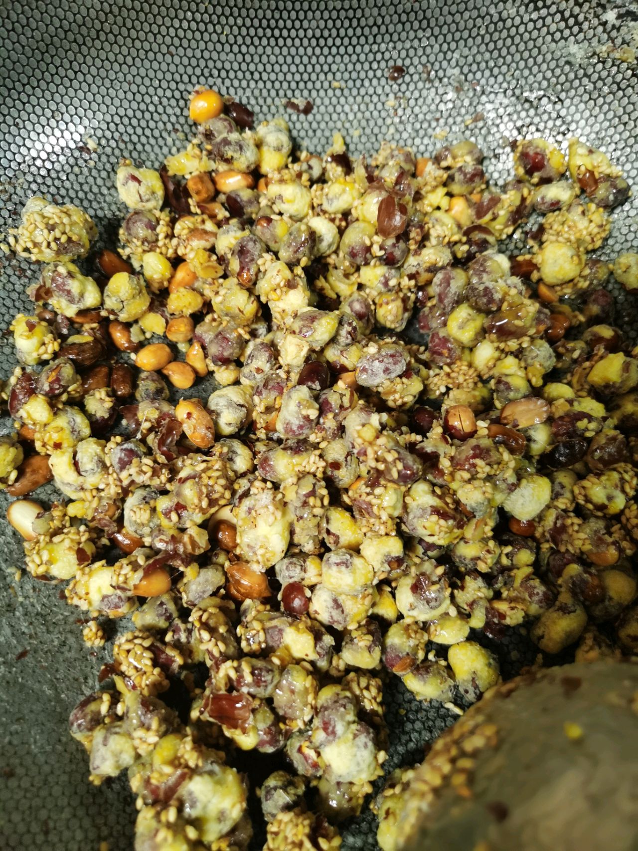 步骤12、最小火,倒入花生芝麻,快速拌匀,关火