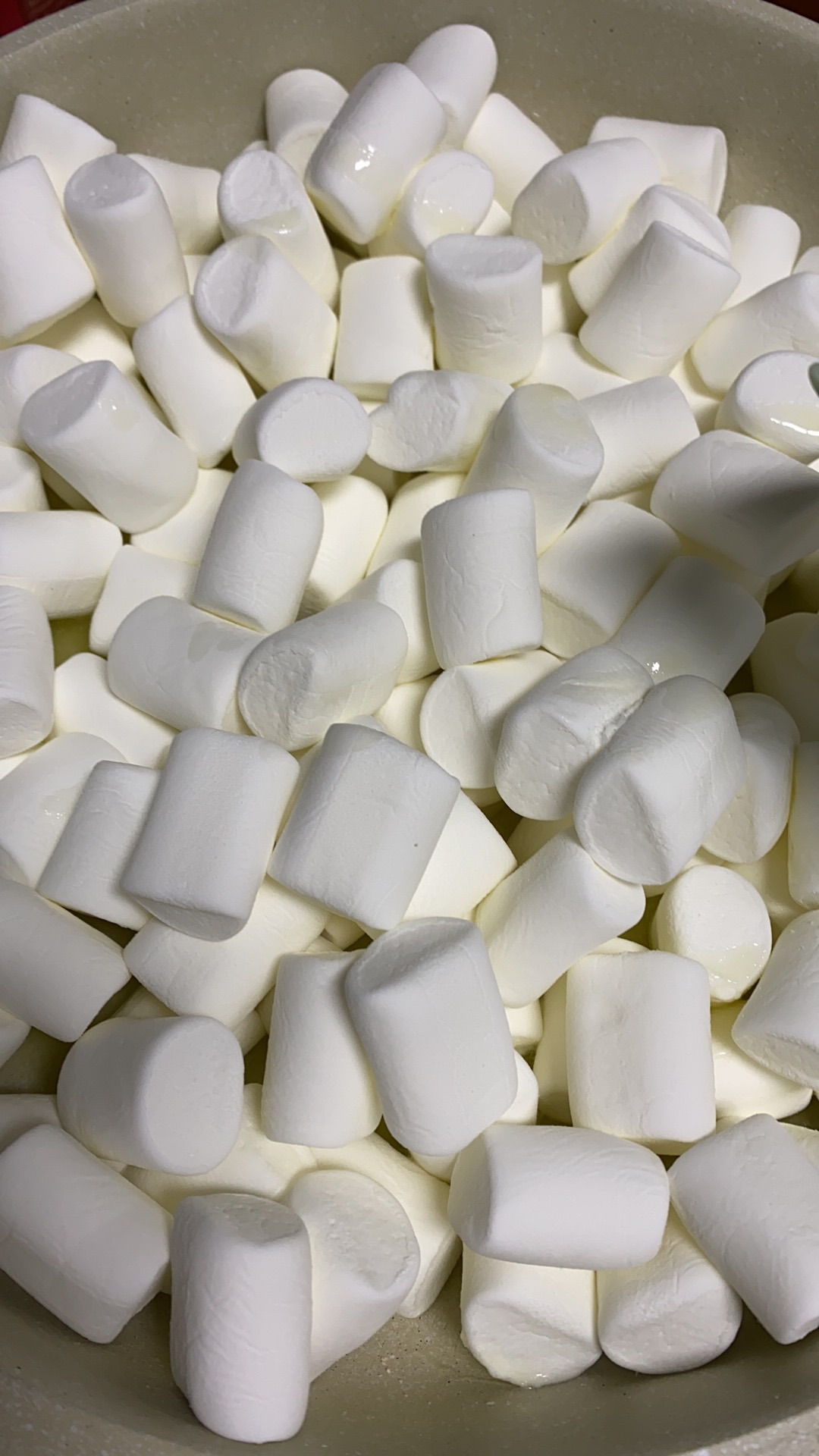 步骤1、电磁炉开最小档,首先将70g黄油放入不粘锅中,化开了之后加入棉花糖