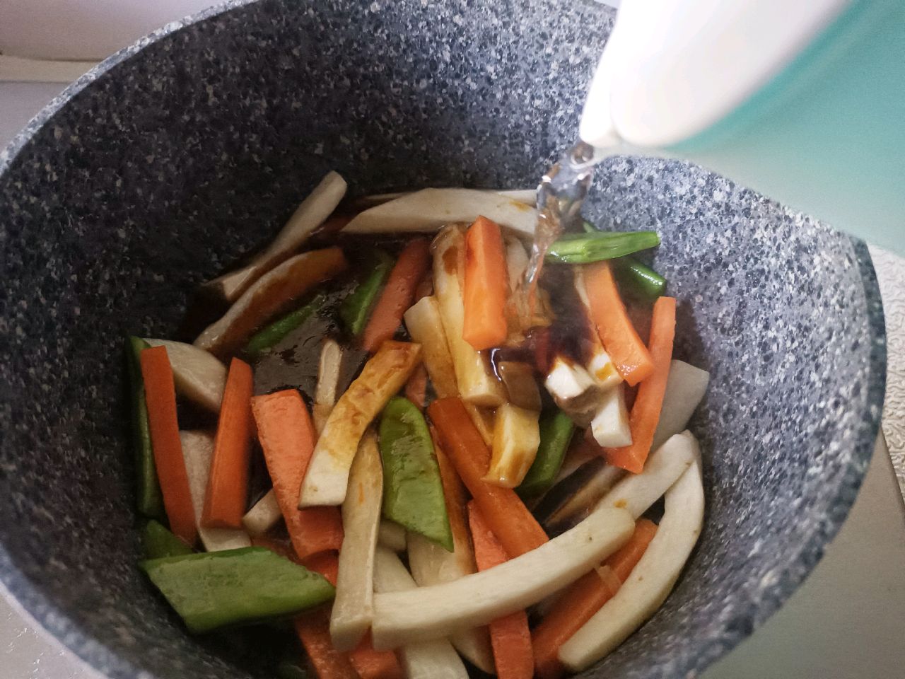 辅料:油豆2根、胡萝卜1小段、味极鲜特级生抽2勺、盐适量、调和油适量、味达美蚝油1勺、六月鲜红烧酱油1勺、味达美料酒1勺、玉米淀粉1勺、纯净水适量、零卡糖1克