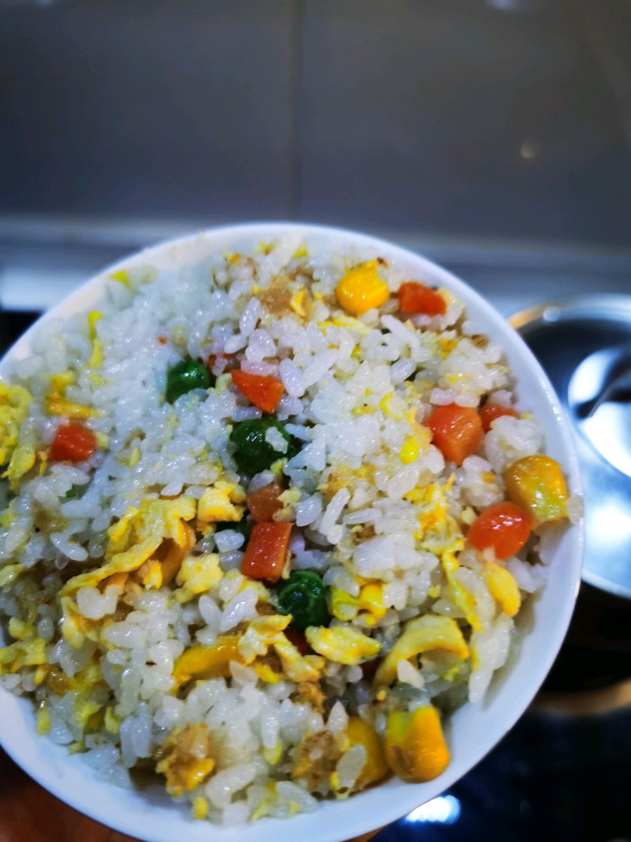 辅料:豌豆粒、胡萝卜丁、葱、胡椒海盐、鸡粉、番茄酱、玉米粒