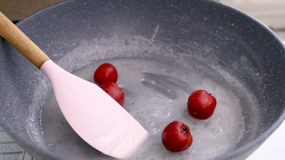 步骤5、加入山楂,然后快速的翻拌,然后慢慢的糖霜就可以挂在山楂上了翻拌的时候注意轻一点,避免把山楂戳破到最后觉得在锅里翻动有点困难了就可以装盘了