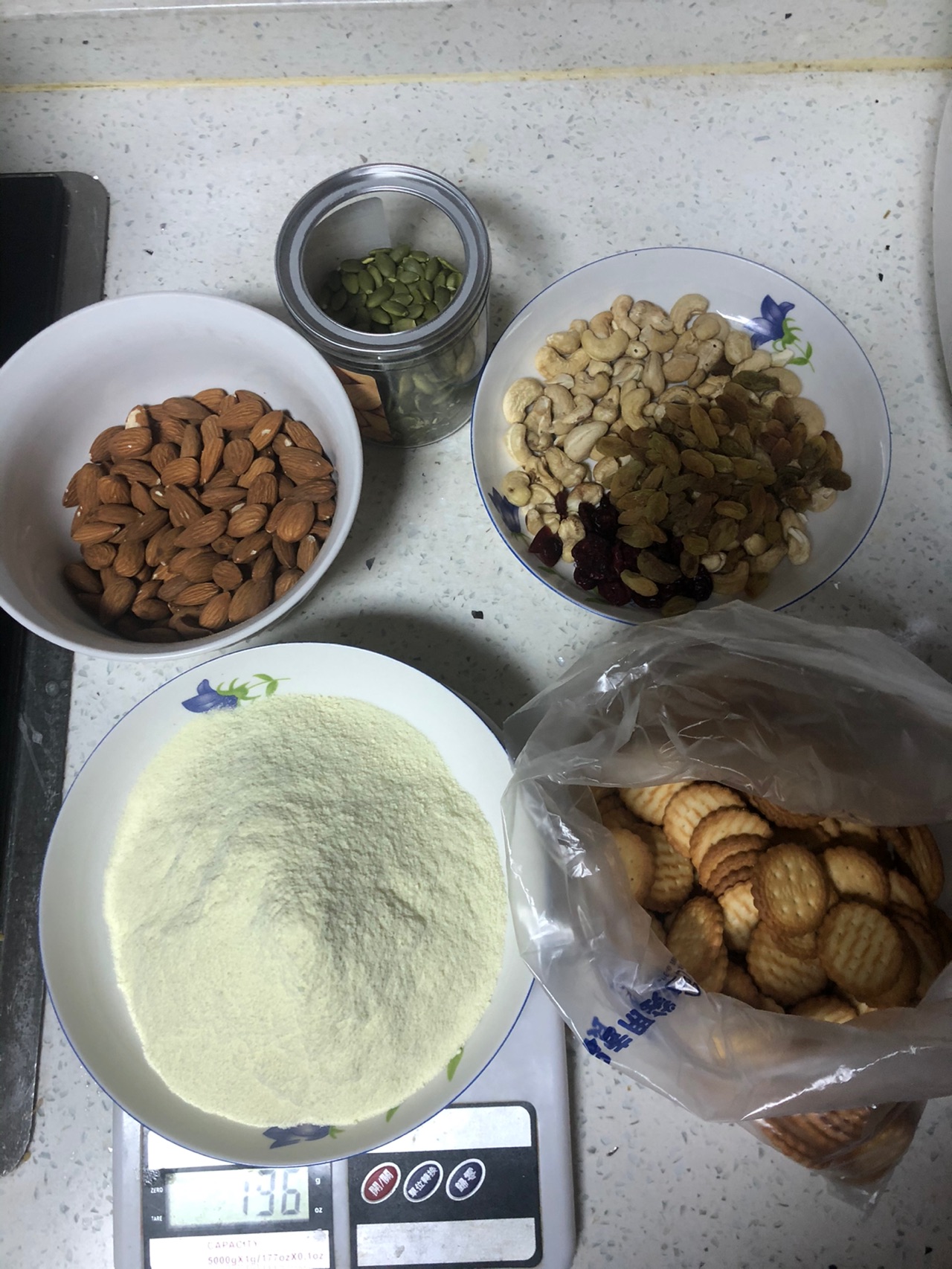 辅料:奶粉200克、杏仁150克、腰果120克、饼干300克、绿葡萄干45克、蔓越莓5克、南瓜子仁100克