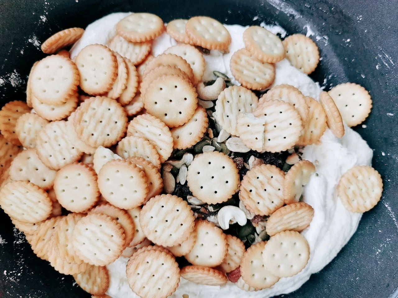 步骤7、奶粉翻拌均匀后放入坚果和饼干