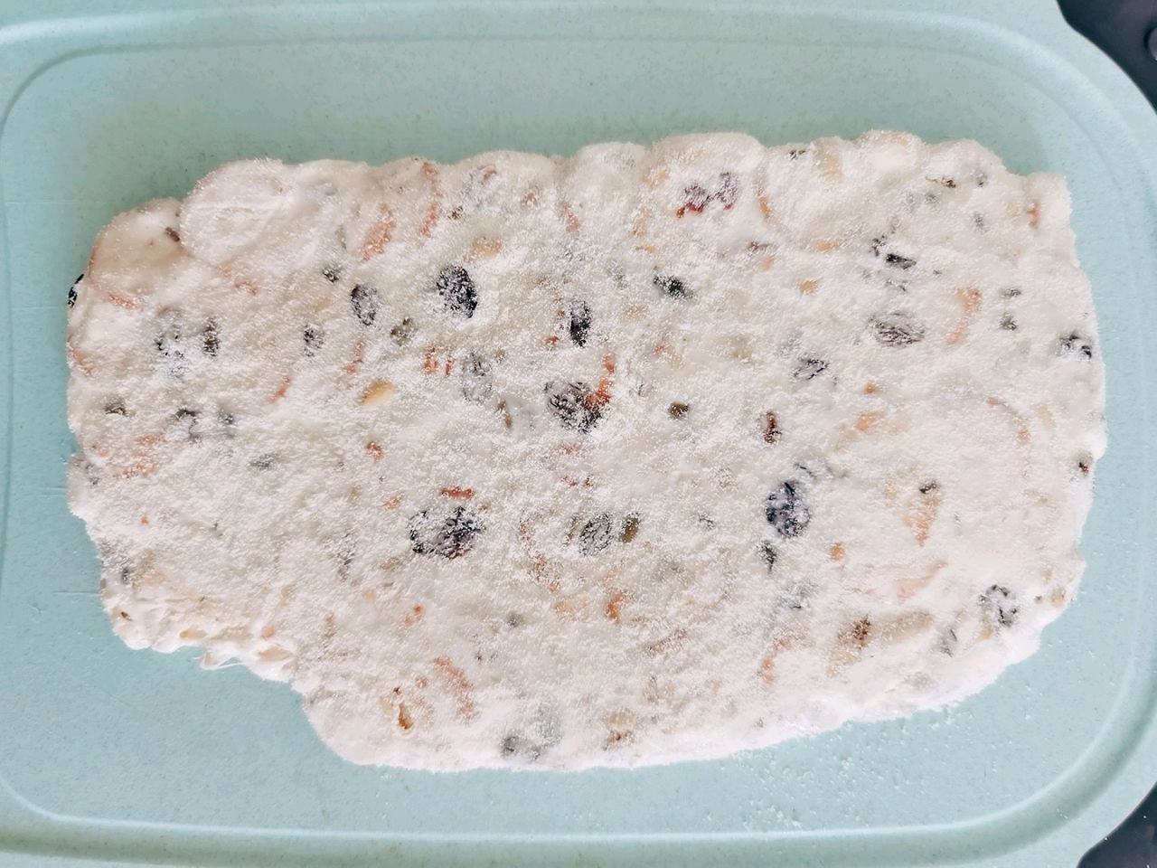步骤8、戴上一次性手套放烤盘中揉均匀(此处有点烫手),放入适量奶粉把表面抹匀,翻面再放入适量奶粉抹匀