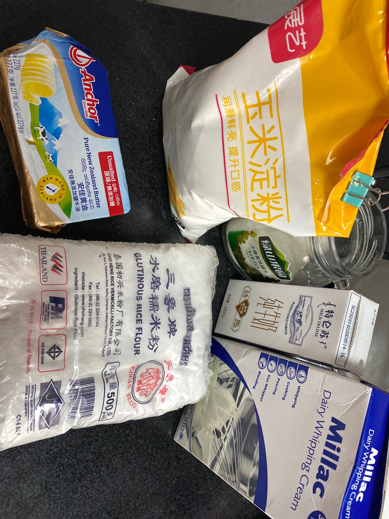 辅料:玉米淀粉45克、白砂糖100克、纯牛奶270克、黄油60克、内陷:、淡奶油400克左右、白砂糖(加淡奶油)35克、芒果、草莓、火龙果等或奥利奥碎适量、糯米粉(炒熟,做熟粉用)60克
